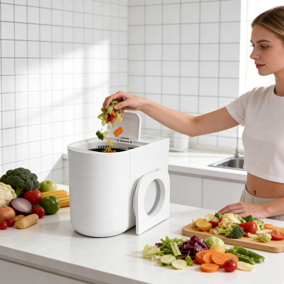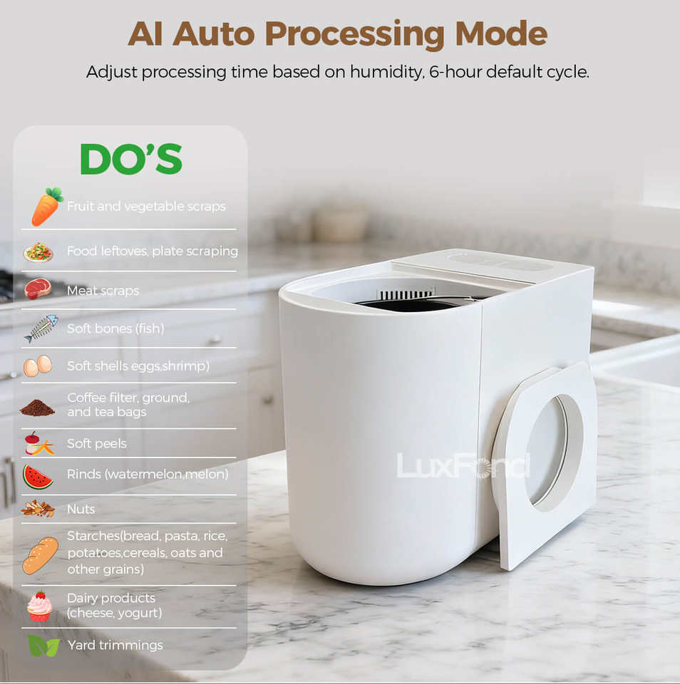 เครื่องทำปุ๋ยหมักขยะอาหารในครัวเรือน LUXFOND สแตนเลส พร้อมระบบตรวจจับความชื้นอัจฉริยะ ควบคุมกลิ่นด้วยแผ่นกรองคาร์บอน ทำงานเงียบ