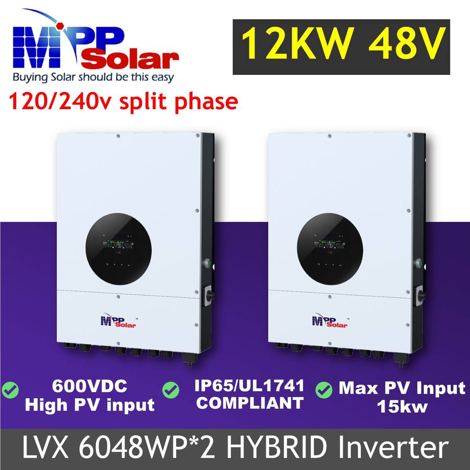 อินเวอร์เตอร์ไฮบริดพลังงานแสงอาทิตย์ LVX6048WP*2 12kw 48v แบบแยกเฟส 120v 240v พร้อมระบบ MPP รองรับการเชื่อมต่อ WiFi ในตัว ได้รับการรับรองมาตรฐาน UL ระดับการป้องกันน้ำและฝุ่น IP65 รองรับการเชื่อมต่อแบบขนานสูงสุด 6 เครื่อง
