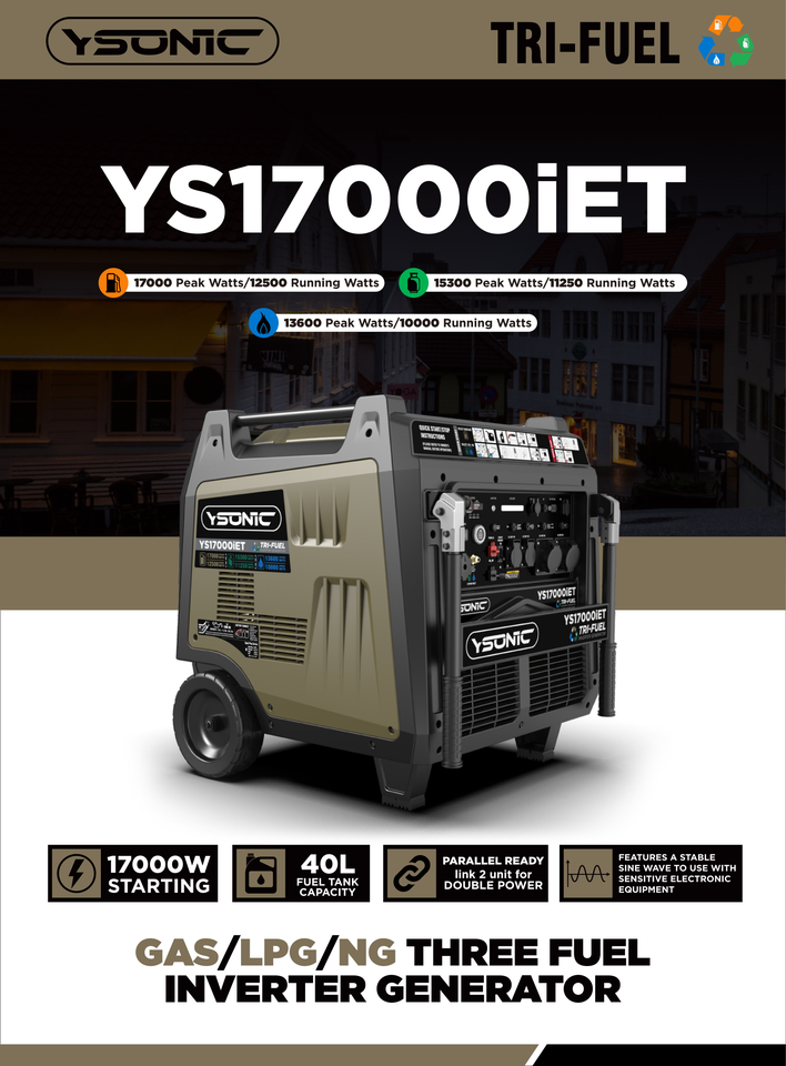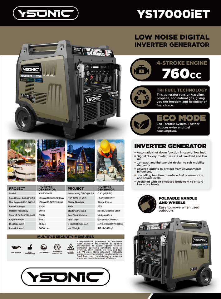 เครื่องกำเนิดไฟฟ้าดิจิตอลอินเวอร์เตอร์แบบระบายความร้อนด้วยอากาศ LYS17000W เสียงเบา ความจุถังน้ำมัน 40 ลิตร ใช้ได้กับน้ำมันเบนซิน/LPG/NG สามชนิดเชื้อเพลิง เครื่องยนต์ 4 จังหวะ โหมดประหยัดพลังงาน
