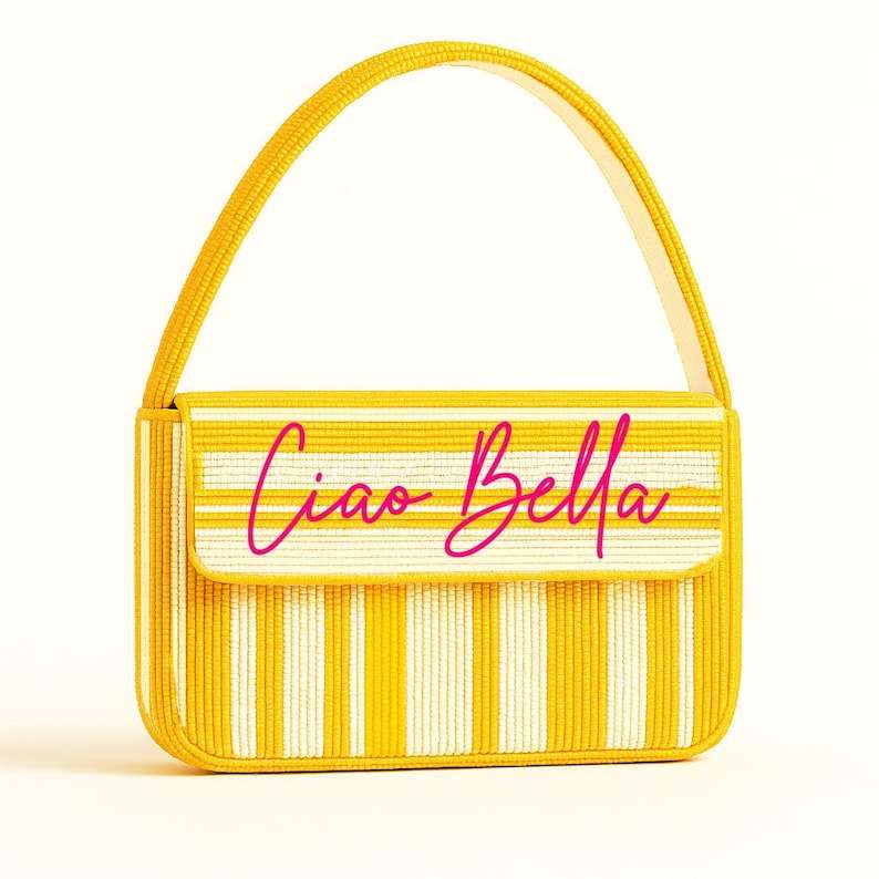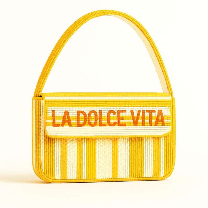 La Dolce Vita กระเป๋าคลัทช์ลูกปัดแก้วสไตล์อิตาเลียนลายขวางสีทองและลูกปัดที่ปรับแต่งได้