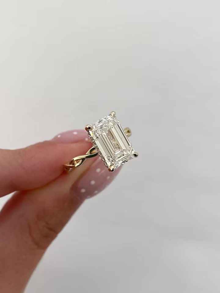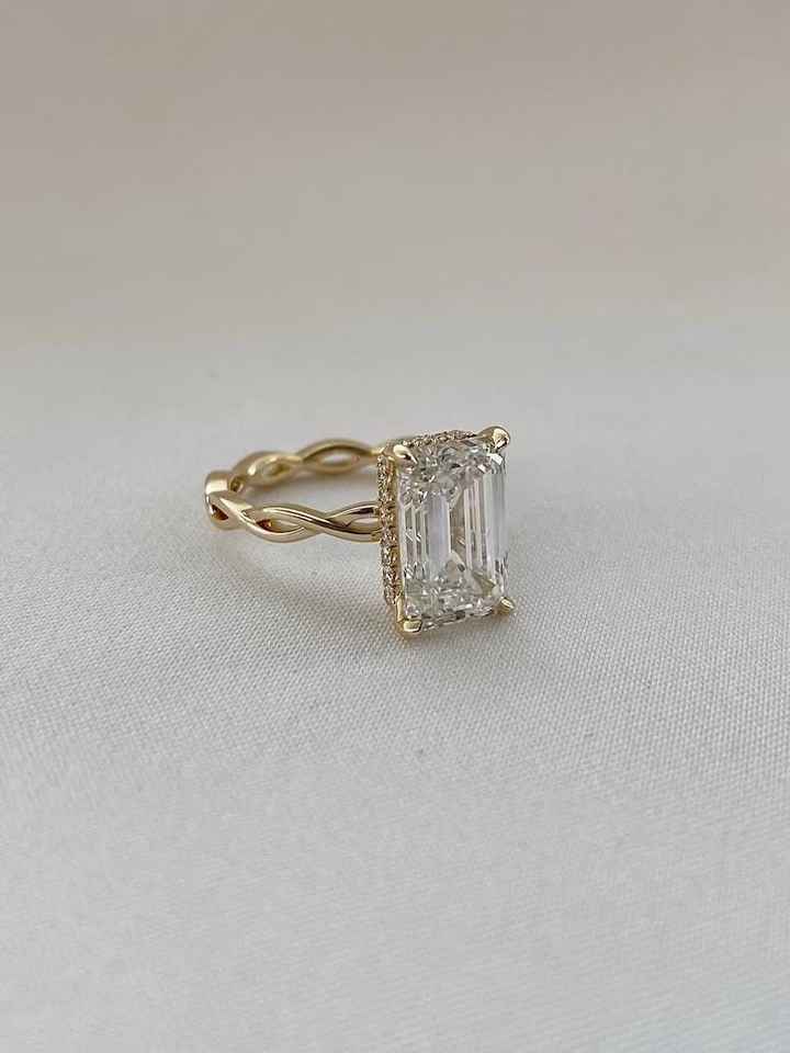 แหวนเพชรทรงเอเมอรัลด์คัท ดีไซน์วงแหวนบิดเกลียว ประดับด้วยเพชรเฮโล