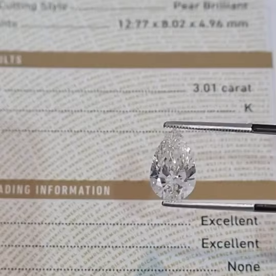 เพชรทรงลูกแพร์เพาะเลี้ยงในห้องปฏิบัติการ 3.00 กะรัต สี E ความสะอาด VVS เจียระไนอย่างดี เจาะด้วยเลเซอร์ สำหรับทำเครื่องประดับ Aniva-A Personal