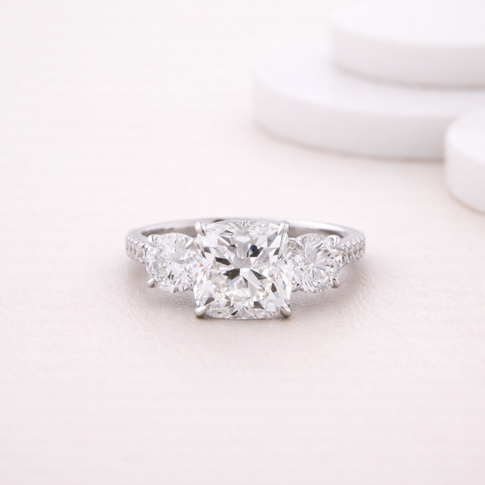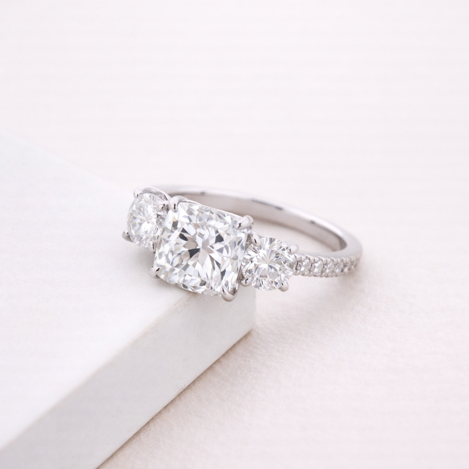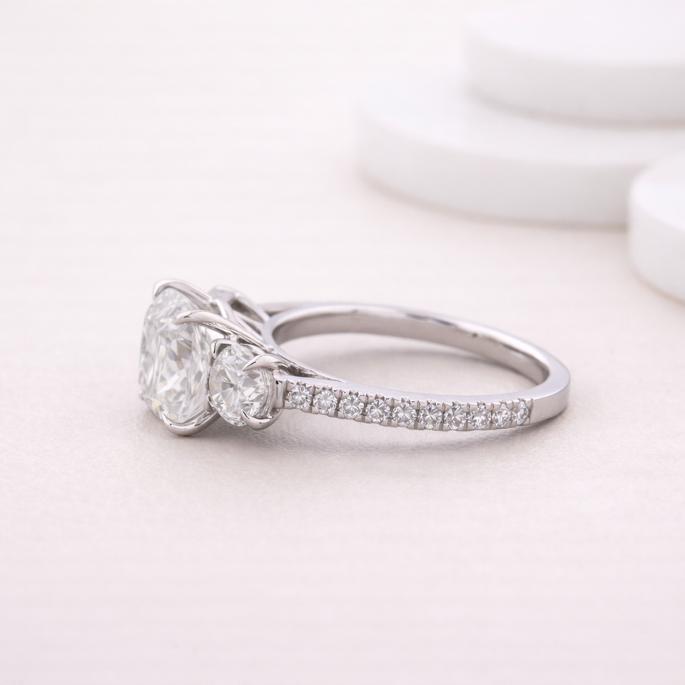 แหวนเพชรทรงคุชชั่นวินเทจเพาะเลี้ยงในห้องปฏิบัติการ ประดับเพชรสามเม็ด ชุบโรเดียม วงแหวนแบบพาเว่ ทองคำขาว/โรสโกลด์/ทองคำเหลือง 9K | เครื่องประดับสั่งทำพิเศษ