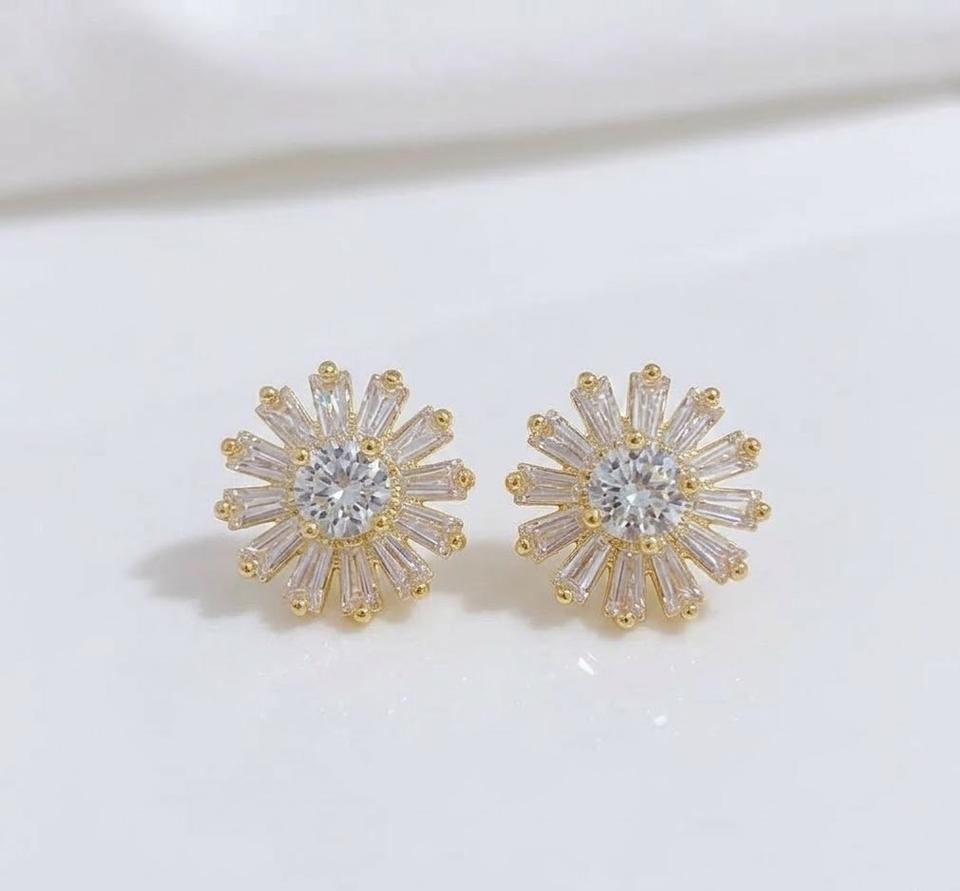 ชื่อสินค้า:ต่างหูทองแท้ 14K ประดับเพชรทรงบาแก็ต ลายดอกทานตะวัน