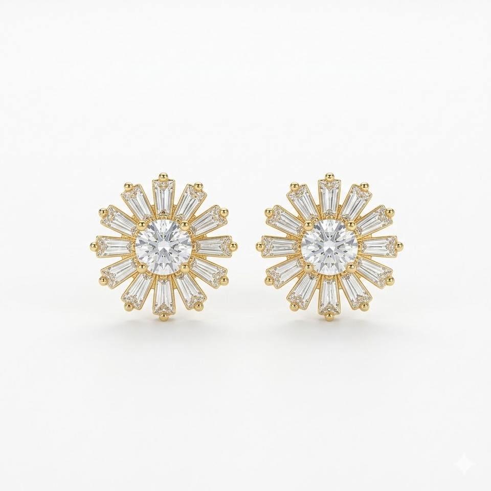ต่างหูเพชรทรงบาแก็ตต์ทองคำ 14K เพชรเลี้ยงในห้องปฏิบัติการ รูปดอกทานตะวัน ต่างหูทองคำแท้รูปดอกไม้สำหรับผู้หญิง ต่างหูรูปดอกเดซี่