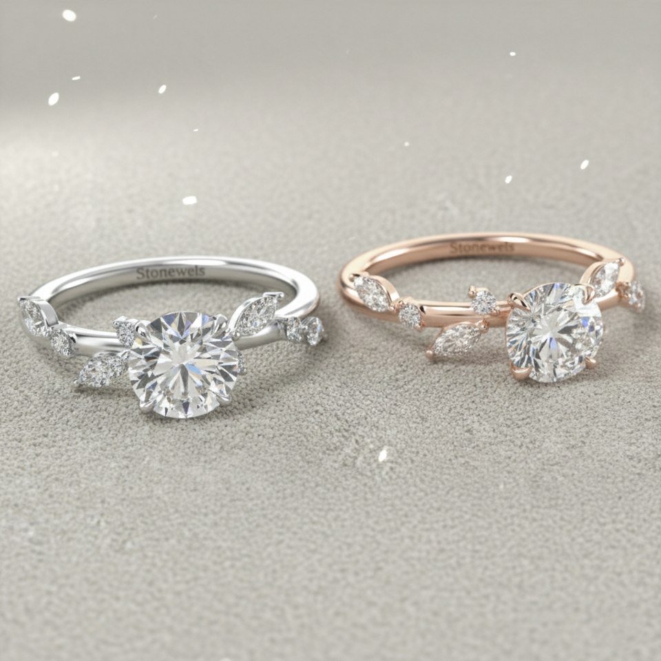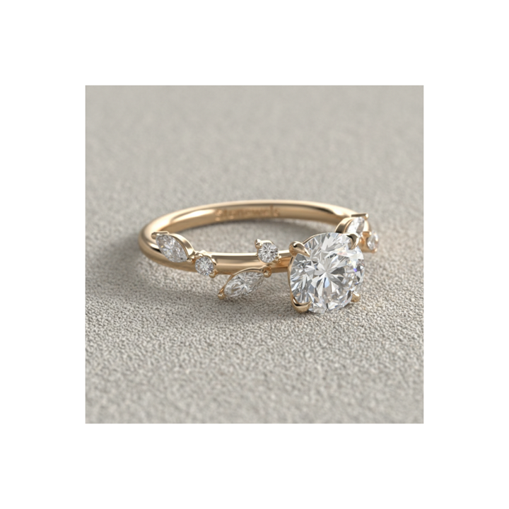 แหวนหมั้นเพชรเลี้ยงในห้องปฏิบัติการ ทรงมาร์คีส์ประดับเพชรตรงกลาง พร้อมเพชรรูปใบไม้ด้านข้าง ชุบทองคำสีกุหลาบ สำหรับแหวนเจ้าสาวหรูหราที่ได้รับการรับรอง