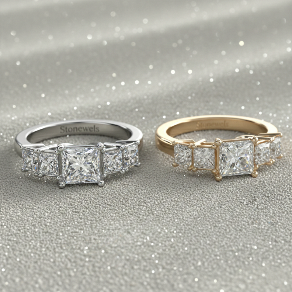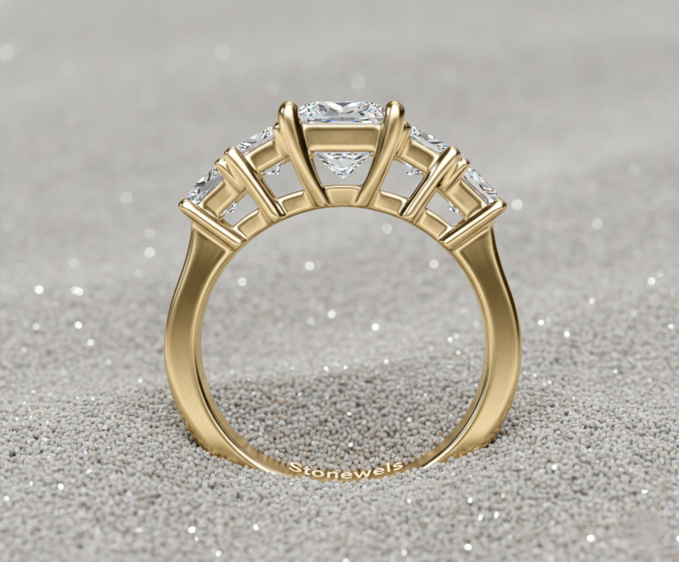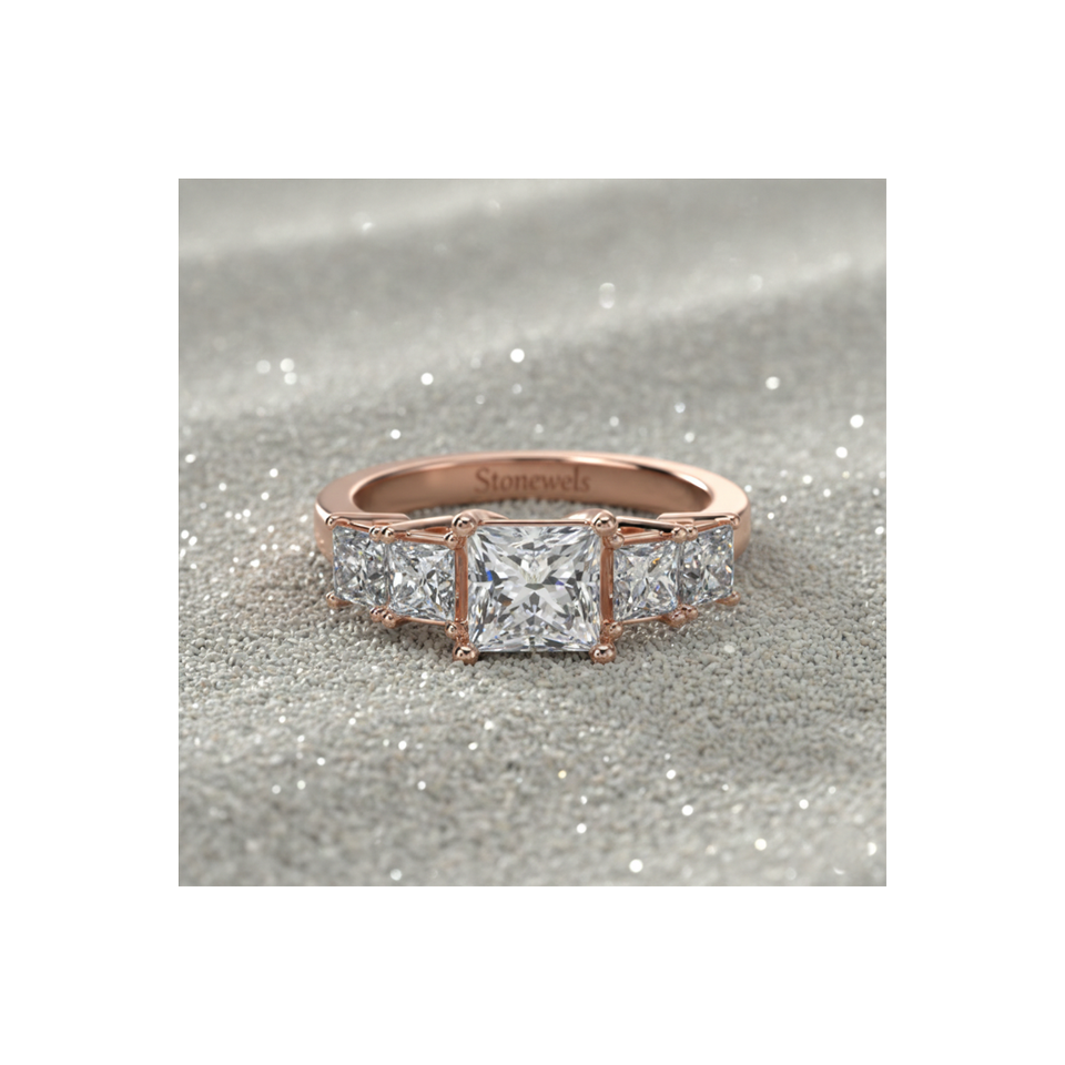 แหวนเพชรทรงปรินเซสคัทจากแล็บโกรว์ ประดับเพชรด้านข้างทรงปรินเซสสี่เม็ด ชุบทองคำสีกุหลาบ ประดับเพชรห้าเม็ด สำหรับแหวนหรูหราที่ได้รับการรับรอง