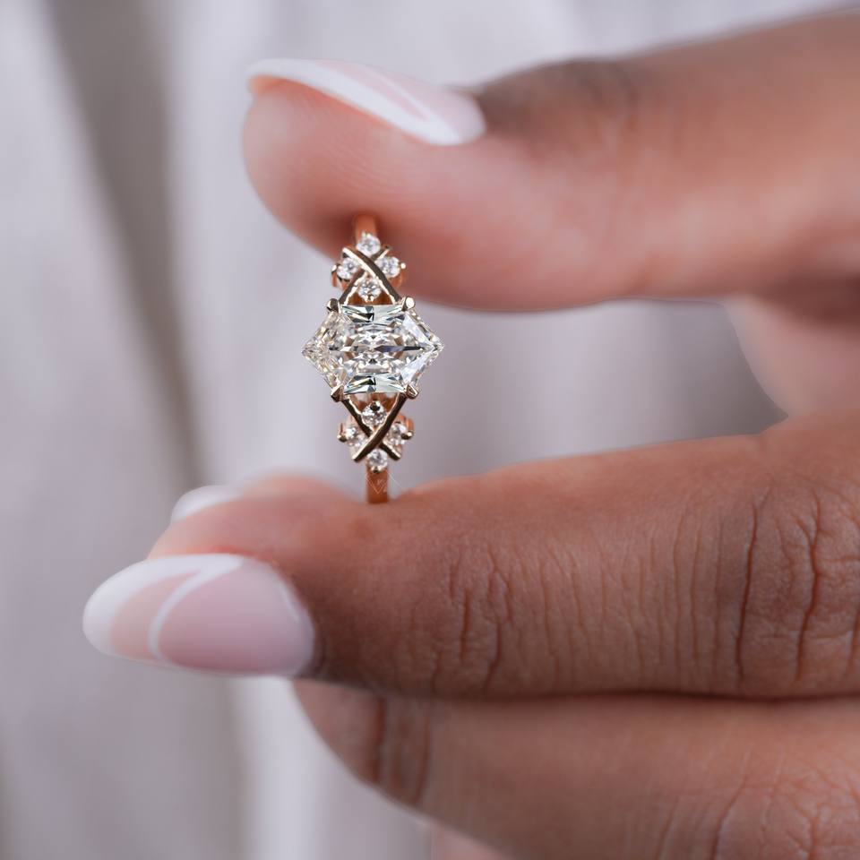 แหวนแต่งงานประดับเพชรสำหรับ1CT ชุดง่ามตัดทรงหกเหลี่ยมและทรงกลมสวยงามแหวนแต่งงานประดับทอง14K แบบโรแมนติกในห้องปฏิบัติการ