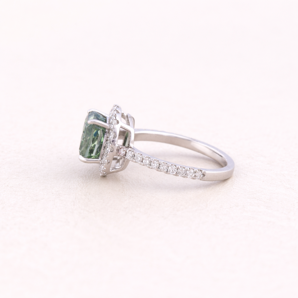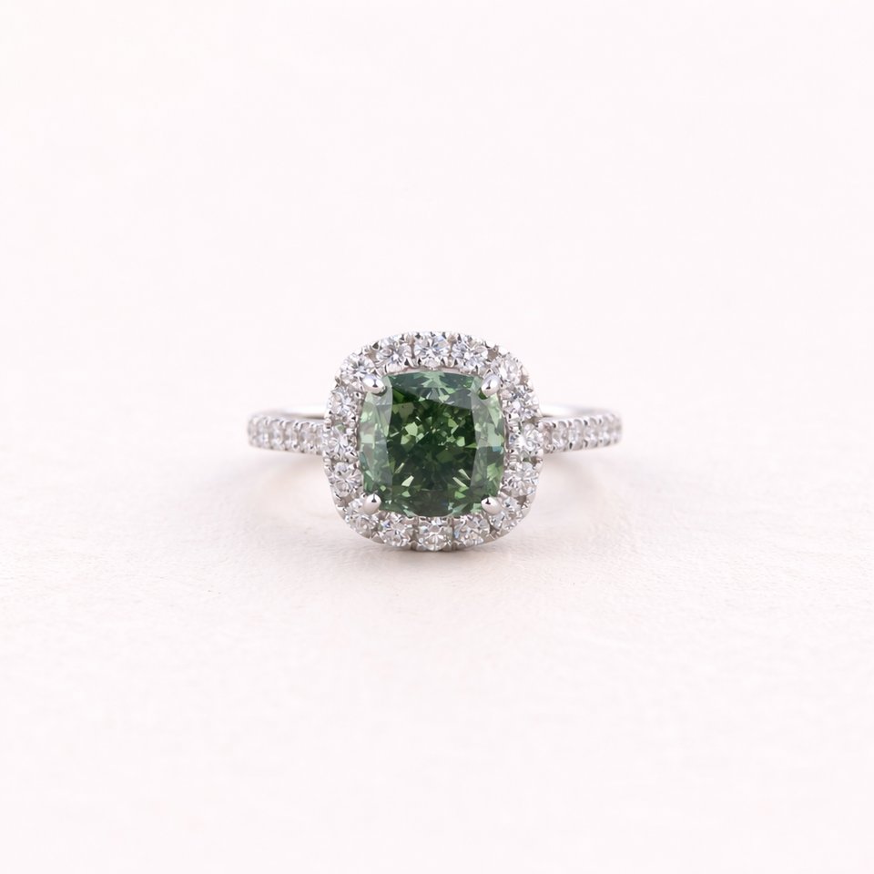 แหวนเพชรทรงคุชชั่นสีเขียวเพาะเลี้ยงในห้องปฏิบัติการ ประดับด้วยเพชรแบบเฮโล ตัวเรือนทองคำขาว/โรสโกลด์/เหลือง 14K | รับรองโดย IGI ชุบโรเดียม หรูหรา สั่งทำพิเศษ