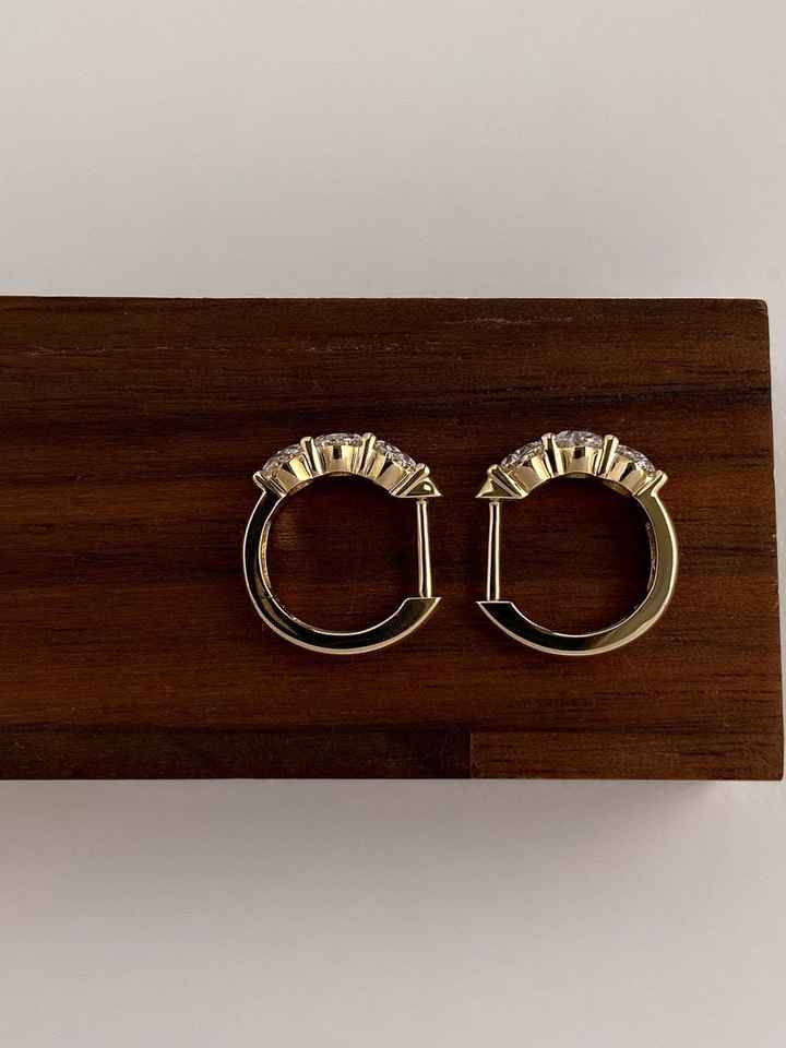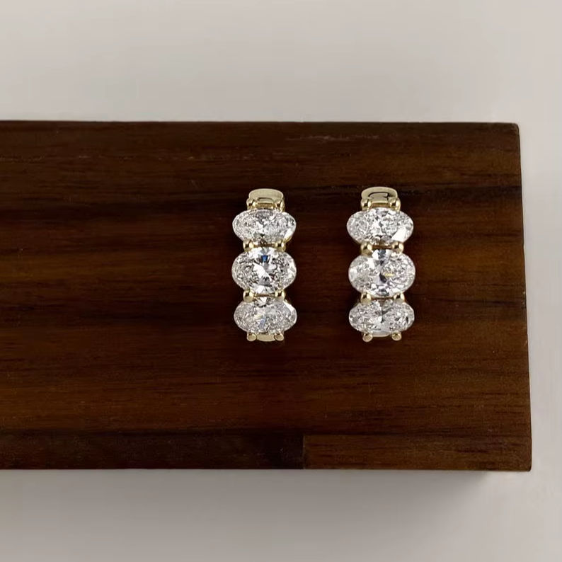 ต่างหูแบบห่วงประดับเพชรทรงรีสามเม็ด ผลิตในห้องปฏิบัติการ พร้อมทองคำแท้ 14K เหมาะสำหรับเป็นของขวัญแทนใจสำหรับผู้หญิง