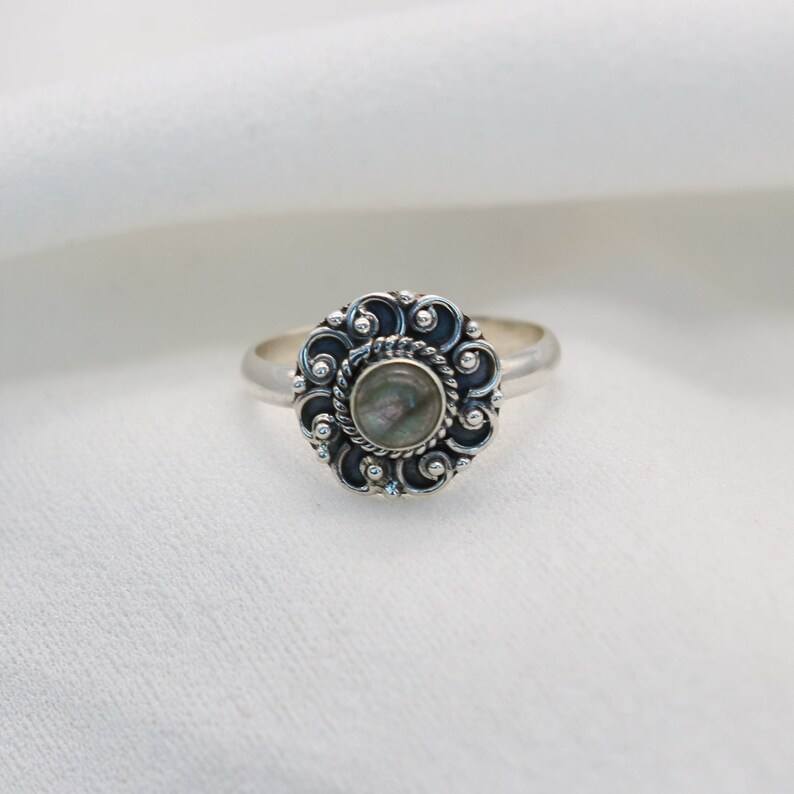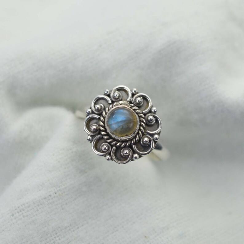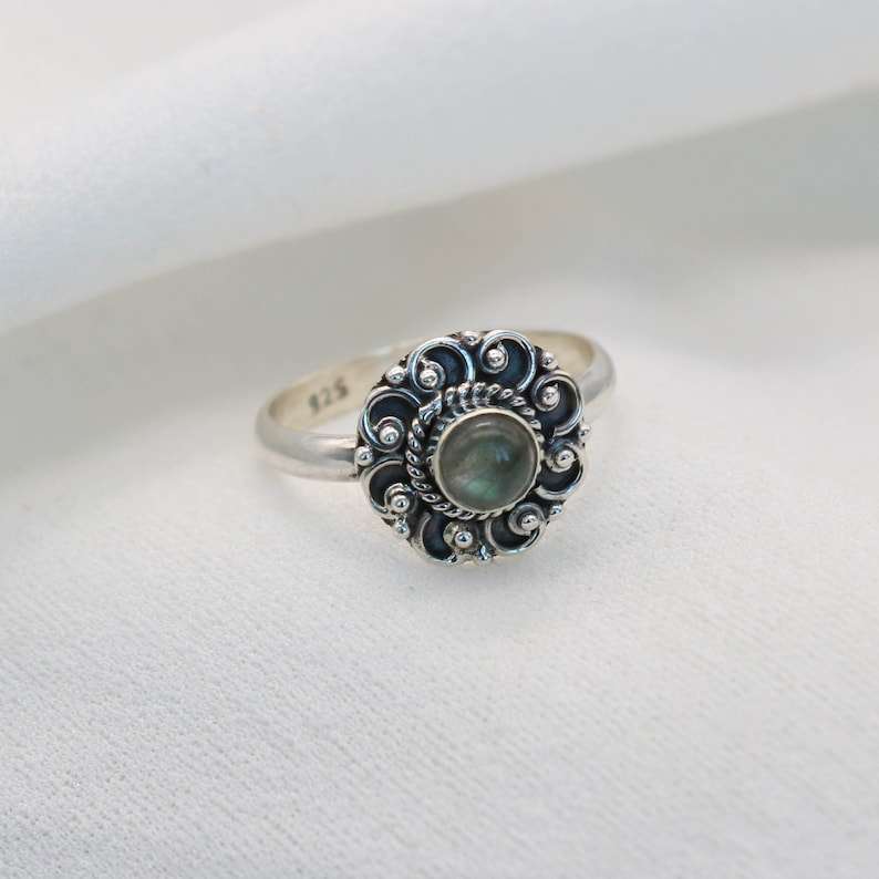 แหวนดอกไม้โรเดียมชุบเงินแท้ 925 ประดับลาบราโดไรต์ พลอยเม็ดเล็ก งานแฮนด์เมด เครื่องประดับวินเทจสุดหรู ของขวัญสุดสง่างามสำหรับผู้หญิง