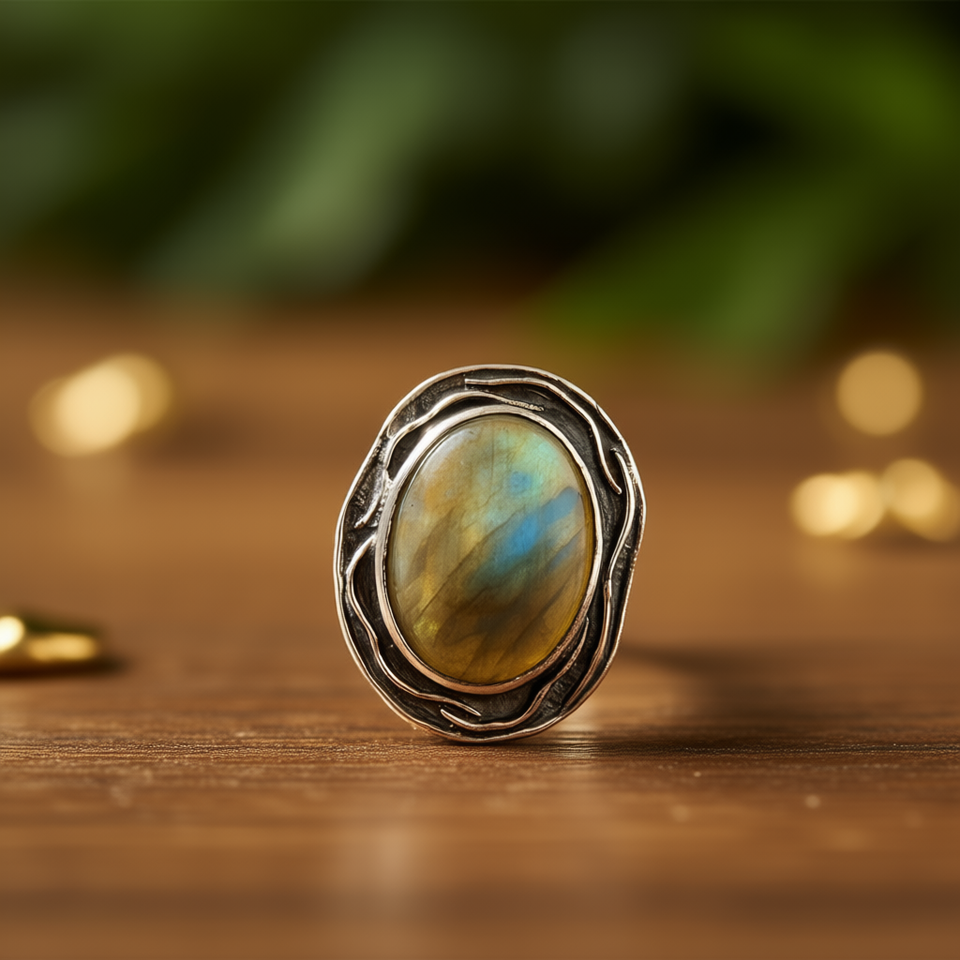 แหวนแฟชั่นลาบราโดไรต์ 6.1 กรัม เครื่องประดับที่หรูหราและมีเอกลักษณ์