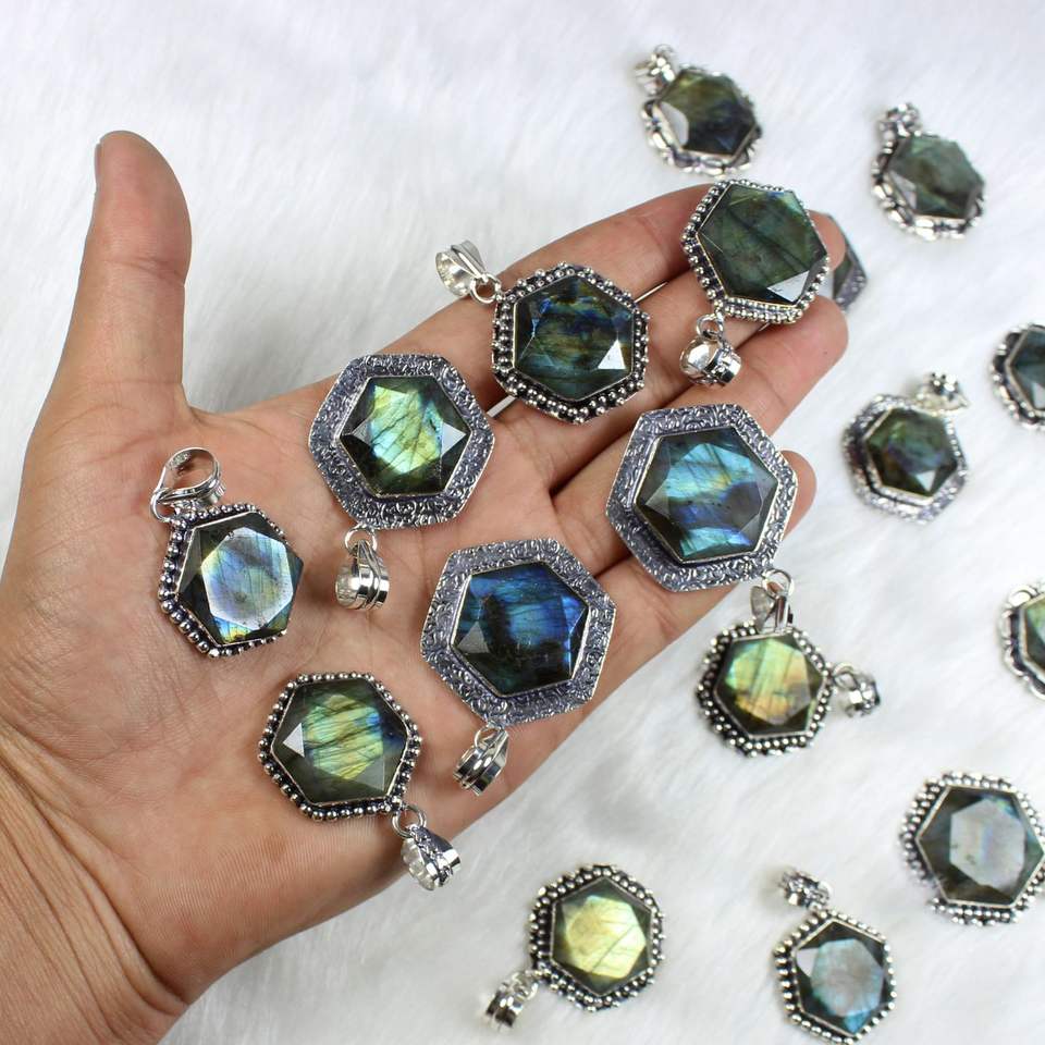 จี้แลบราโดไรต์ดีไซน์แบบหกเหลี่ยมเครื่องประดับอัญมณีชุบเงินจี้ลาบราดอไรต์ทรงหกเหลี่ยม