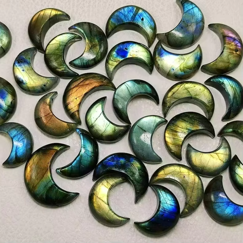 ลาบราโดไรต์คุณภาพสูง ขัดเงาเรียบ รูปพระจันทร์เสี้ยว คาโบชอง อเกต พลอย แสงสีฟ้าเปลี่ยนสี สำหรับงานแกะสลัก