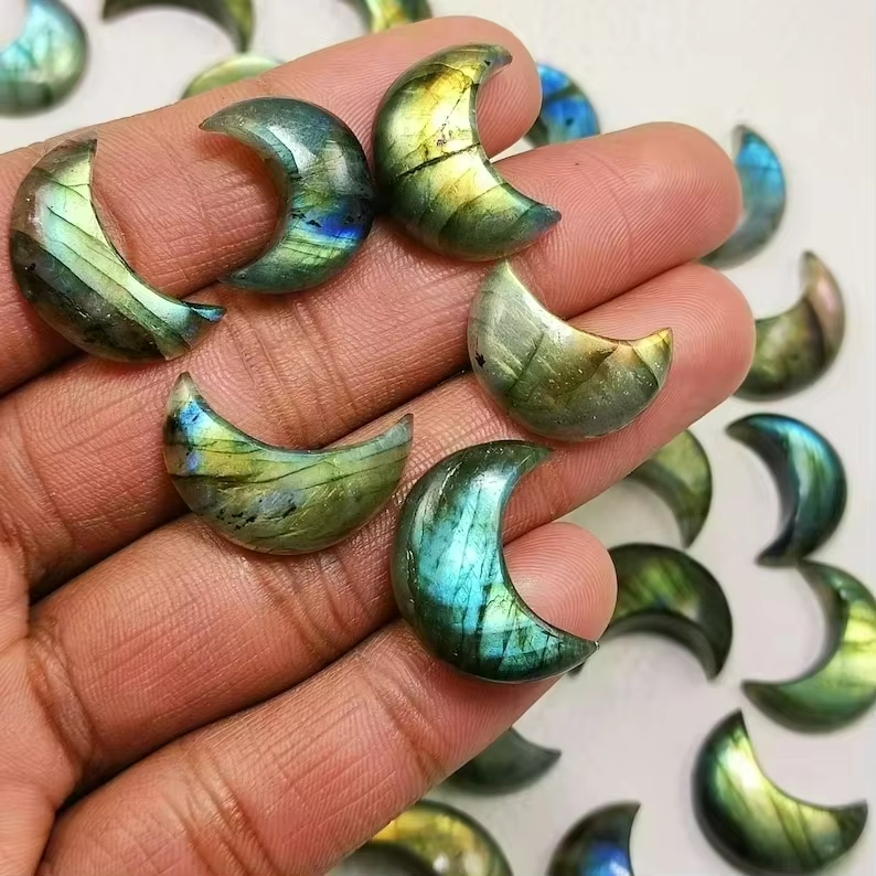 ลาบราโดไรต์คุณภาพสูง ขัดเงาเรียบ รูปพระจันทร์เสี้ยว คาโบชอง อาเกต พลอยสีฟ้า ประกายไฟ สำหรับงานแกะสลัก