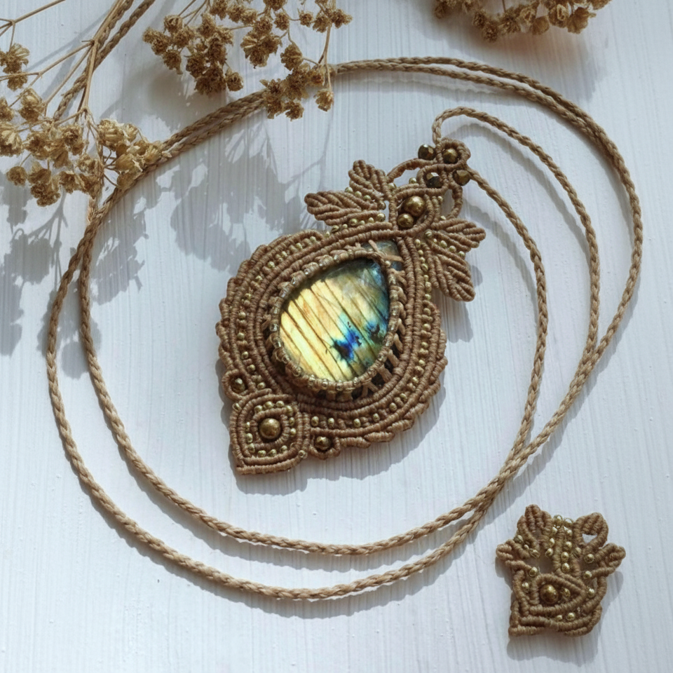 สร้อยคอ labradorite macrame ของแท้จากธรรมชาติพร้อมลูกปัดทองเหลืองขนาดเล็กด้ายทำด้วยมือแบบปรับได้สำหรับของขวัญในงานแต่งงาน
