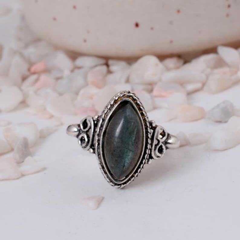 แหวนลาบราดอไรต์ทรงมาร์ควิส ดีไซน์ฟิลิกไรส์เงินออกซิไดซ์ เครื่องประดับหินเสริมพลัง วินเทจ โบโฮ ของขวัญ