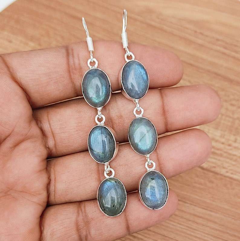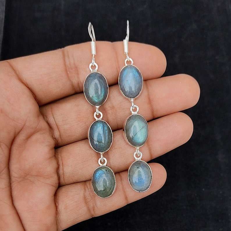 ต่างหูห้อยหินแบบหลายชิ้นของลาบราดอไรต์925ต่างหูคริสตัลสายสะพายหูชุบเงินทำด้วยมือของขวัญเครื่องประดับแนวโบโฮสำหรับเธอ