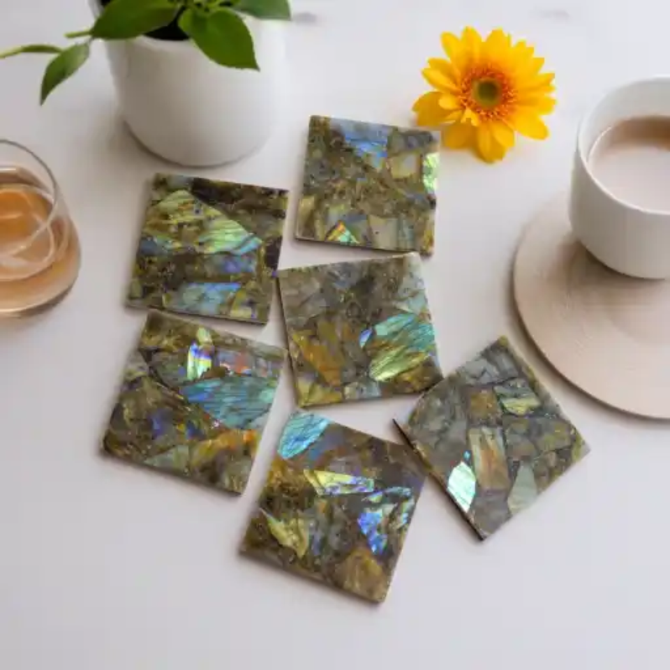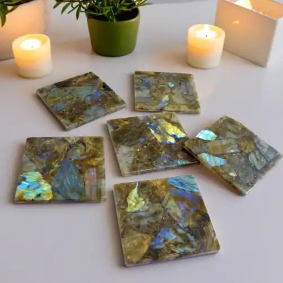 แผ่นรองแก้วทำจากหินลาบราโดไรต์ธรรมชาติ | ชุดจานรองแก้วปริซึมเชน | ของตกแต่งบ้านสุดหรู | สีรุ้งน้ำเงินอมเขียว