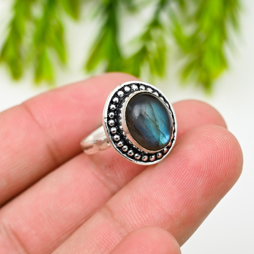 แหวนชุบเงิน10X14มม. สำหรับผู้หญิงหินลาบราดอไรต์ธรรมชาติรูปไข่ทำด้วยมือ