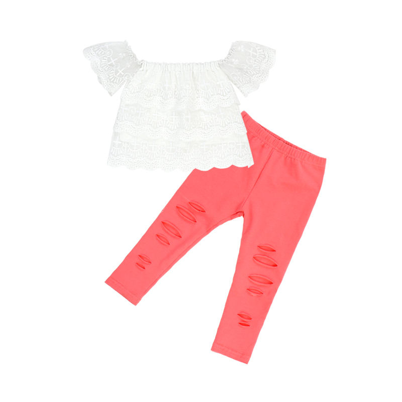 ลูกไม้ ruffles ปิดไหล่เสื้อและ snakeskin กระดิ่งด้านล่างกางเกงเสื้อผ้าเด็ก 1 ชุดเด็กผู้หญิงเสื้อผ้าเด็กเสื้อผ้าชุด
