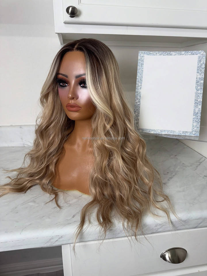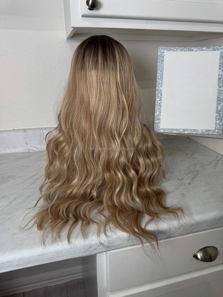 วิกผมลูกไม้คุณภาพเยอรมัน สีทองบาลายาจ ลอนคลื่น ผมแท้ 100% ไฮไลท์ วิกผมลูกไม้สวิสแบบด้านหน้า