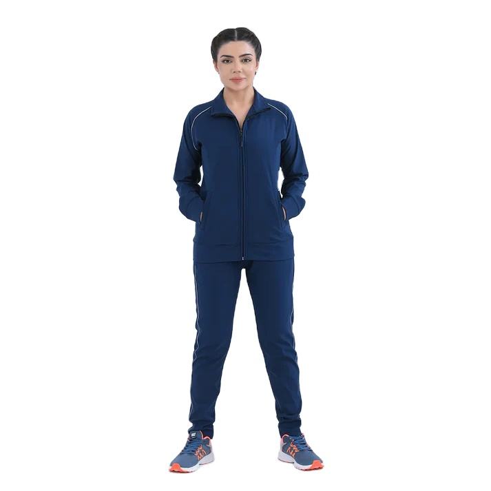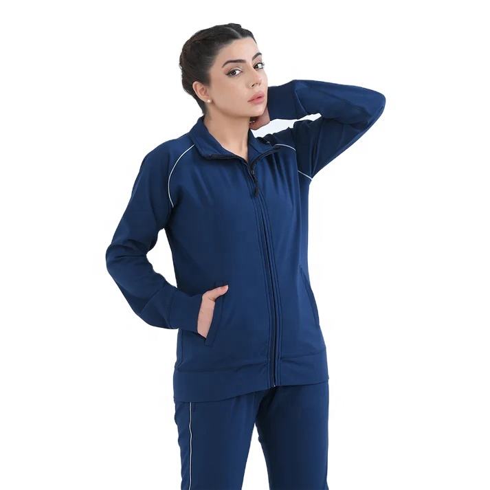 ชุดวอร์มสำหรับผู้หญิงชุดออกกำลังกายผ้าโพลีเอสเตอร์ระบายอากาศสีน้ำเงินเข้มชุดออกกำลังกายชุดวิ่งจ๊อกกิ้งและชุดกีฬา