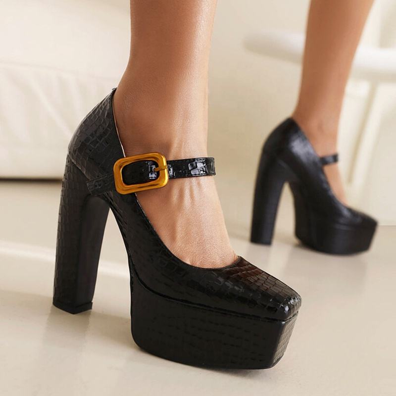 รองเท้าส้นสูงแบบแพลตฟอร์มสีเขียวลายสัตว์สำหรับผู้หญิง ส้นหนา หัวเหลี่ยม สายรัดแบบหัวเข็มขัด สไตล์แมรี่เจน