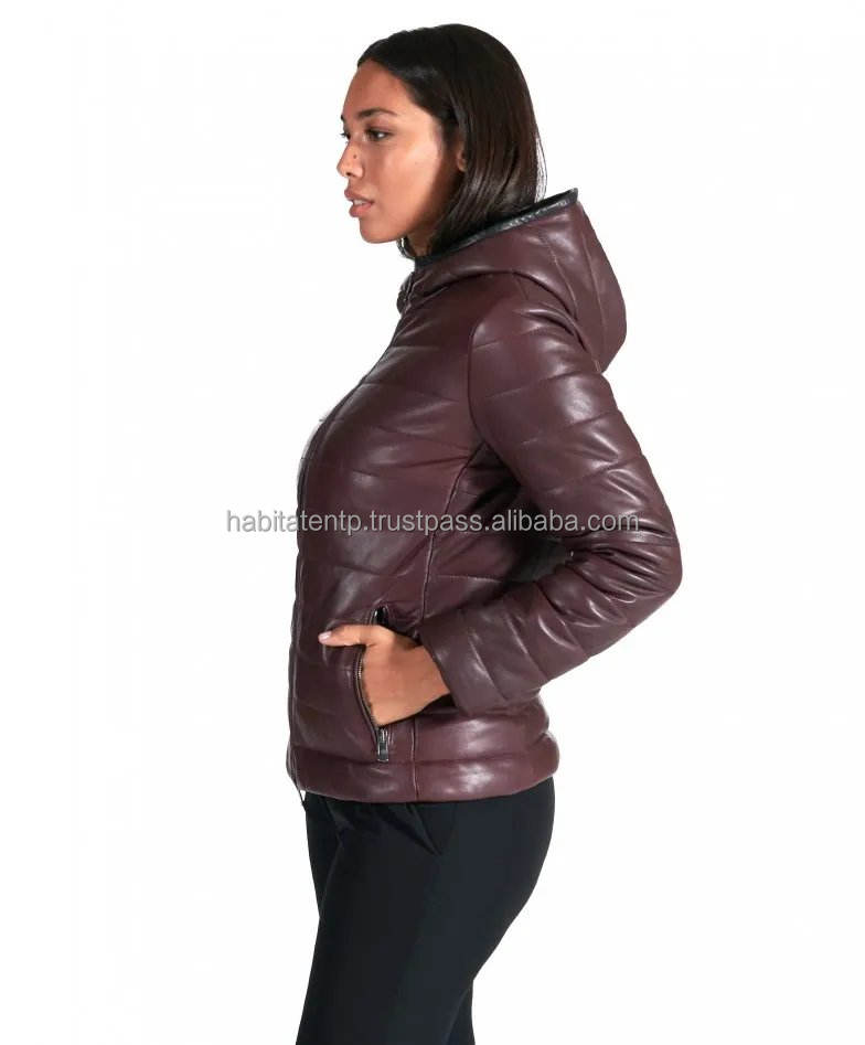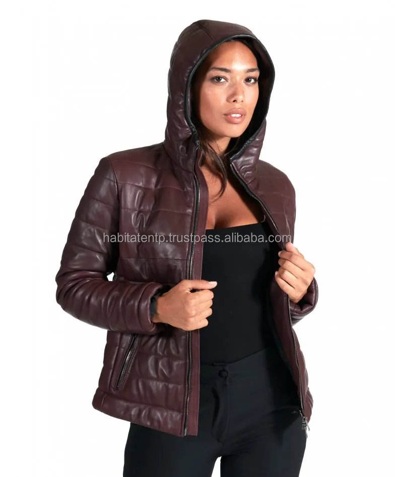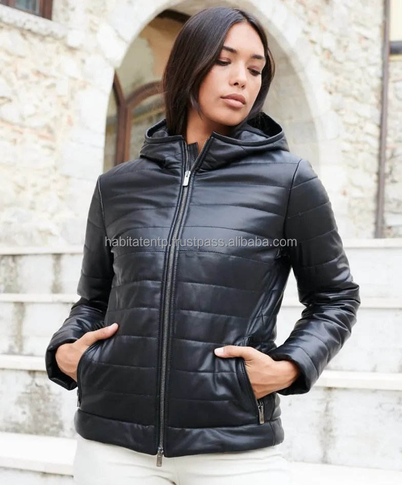 เสื้อแจ็คเก็ตหนังแท้สีดำสำหรับผู้หญิง มีฮู้ด หนังแกะแท้ 100% ร้านค้าออนไลน์