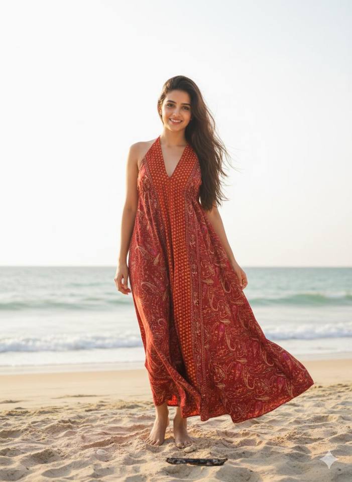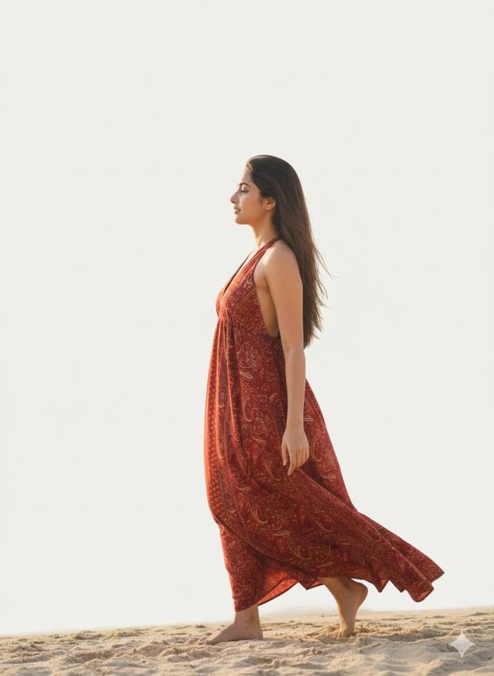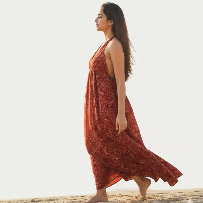 เดรสแม็กซี่พิมพ์ลายบล็อกสำหรับผู้หญิง คอวี แขนกุด สไตล์ลำลอง ทรงหลวม โบฮีเมียน ผ้าฝ้าย ชุดลำลองและเทรนด์แฟชั่นสำหรับผู้หญิง