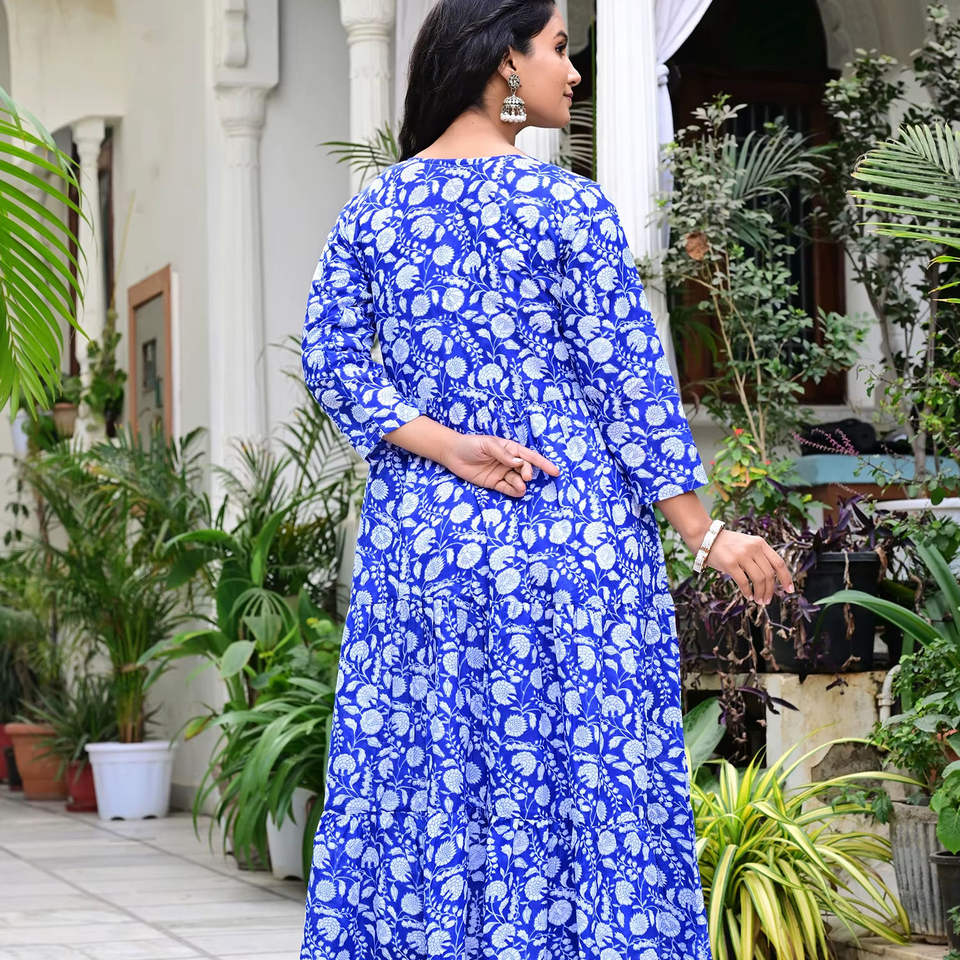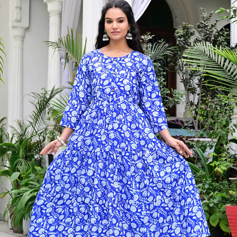 เดรสสีน้ำเงินลายเรขาคณิต ผ้าฝ้ายทอ 100% ความยาวครึ่งน่อง แขน 3/4 เอวทรงเอ็มไพร์ สไตล์ลำลอง เป็นมิตรกับสิ่งแวดล้อม ติดกระดุม ทรงเอไลน์