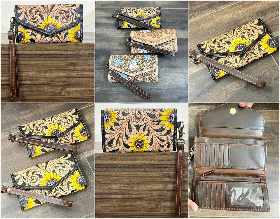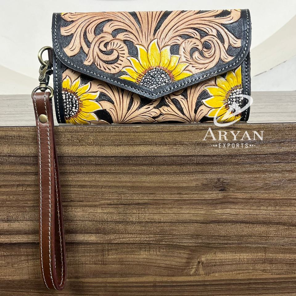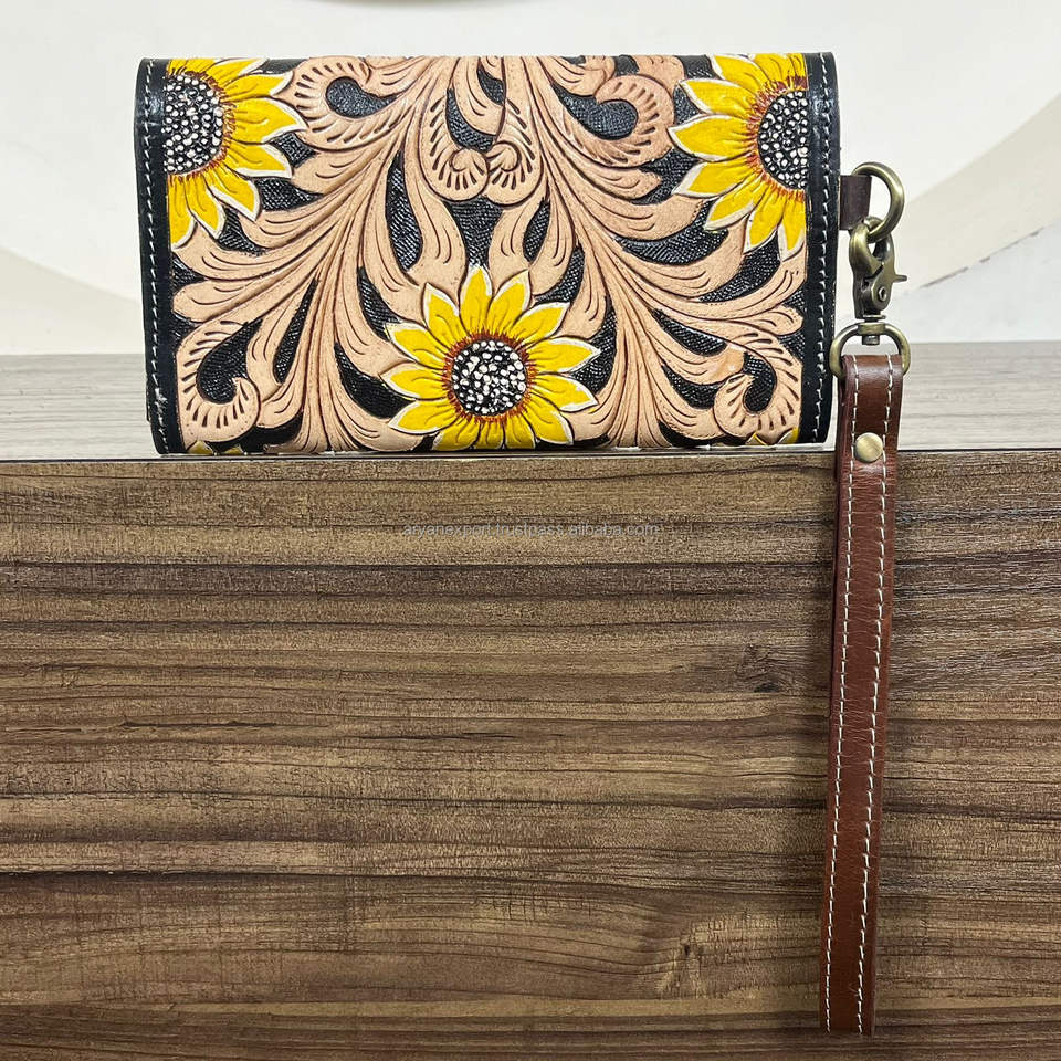 Product Name:Hand Tooled Leather Sun Flower Wristlet Wallet