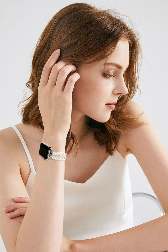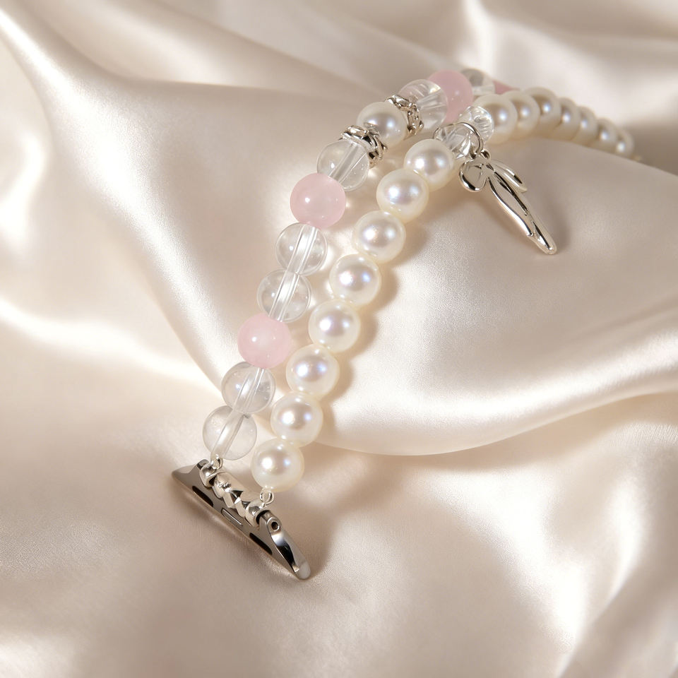 สายนาฬิกาไข่มุกหรูหราสำหรับสุภาพสตรี ขนาด 16 มม. สาย OEM สำหรับนาฬิกาขนาด 38 มม./42 มม. พร้อมสายรัดแบบผีเสื้อประดับคริสตัล