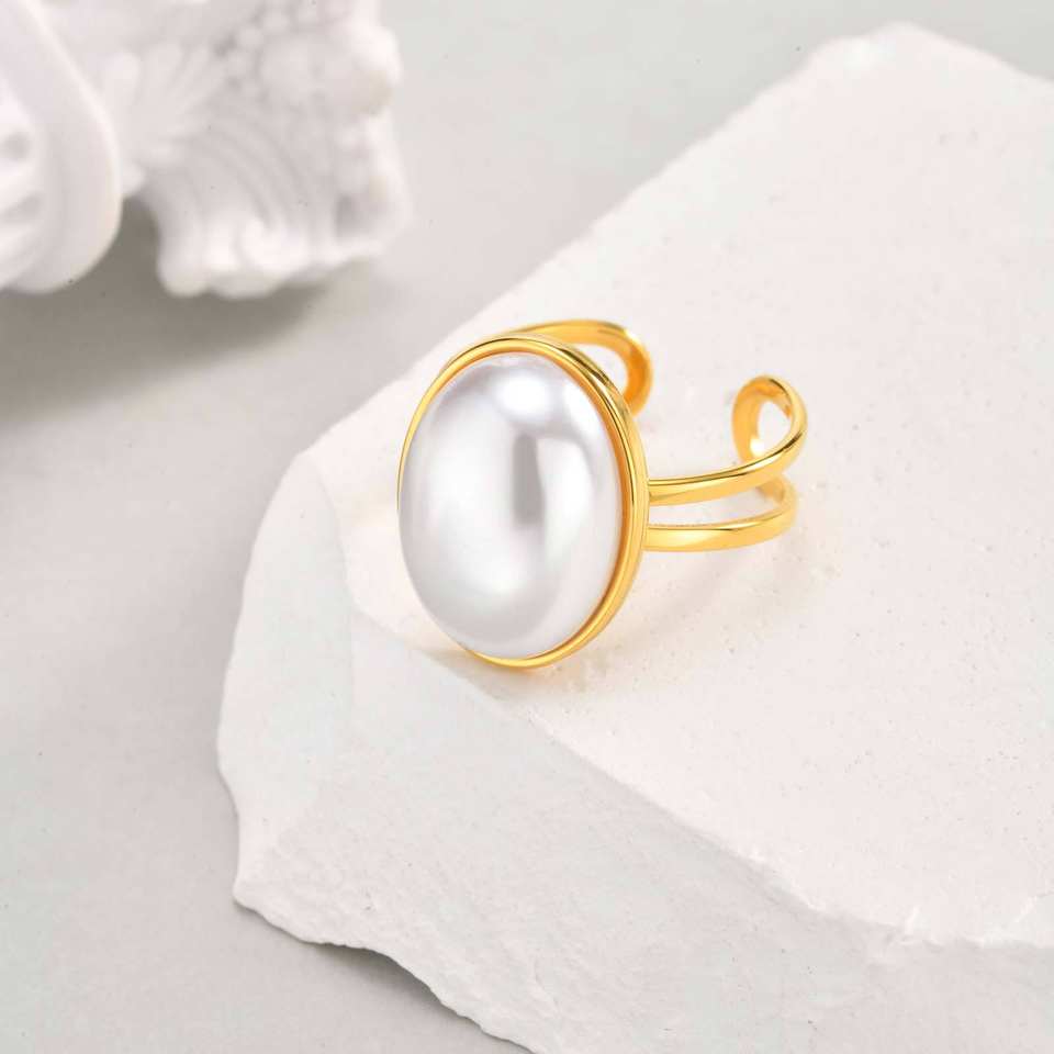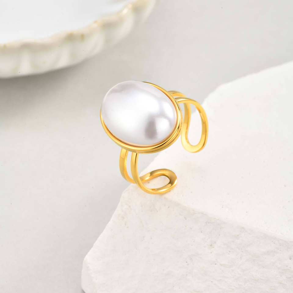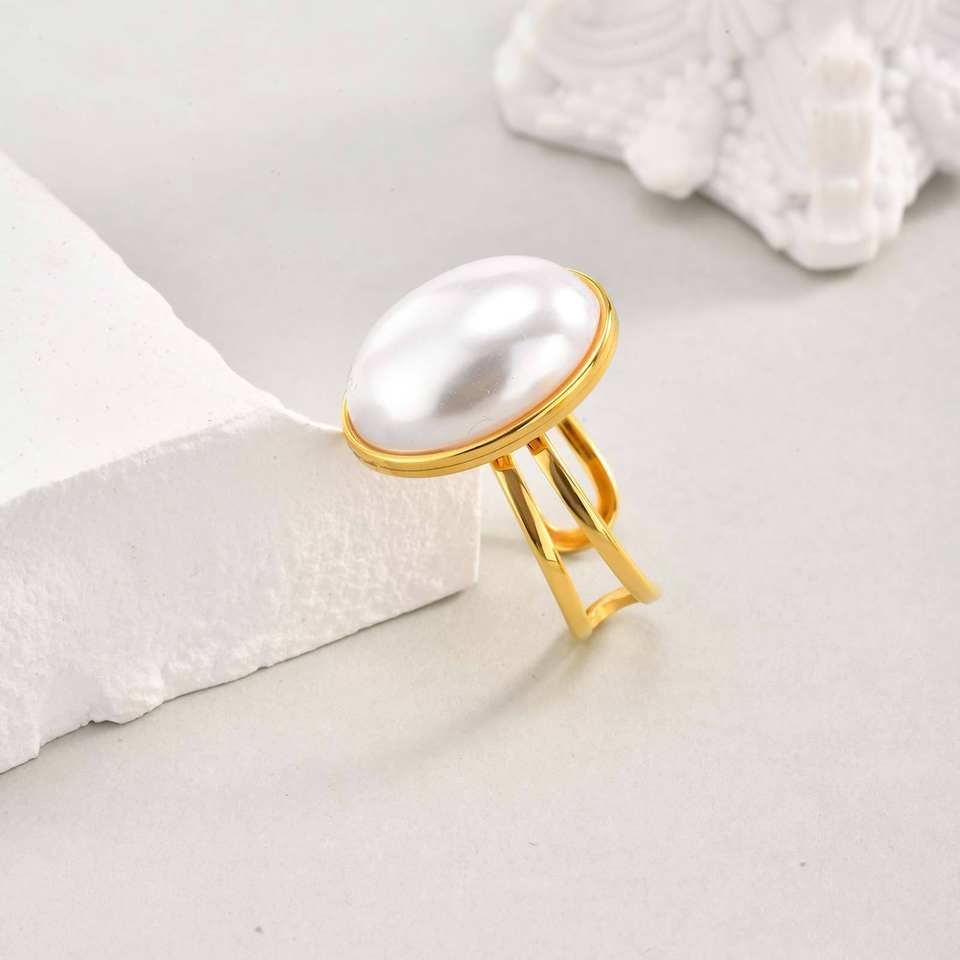 แหวนเปิดรูปไข่ประดับมุกเทียมชุบทองสแตนเลสแฟชั่นสไตล์ยุโรปและอเมริกาสำหรับสุภาพสตรี