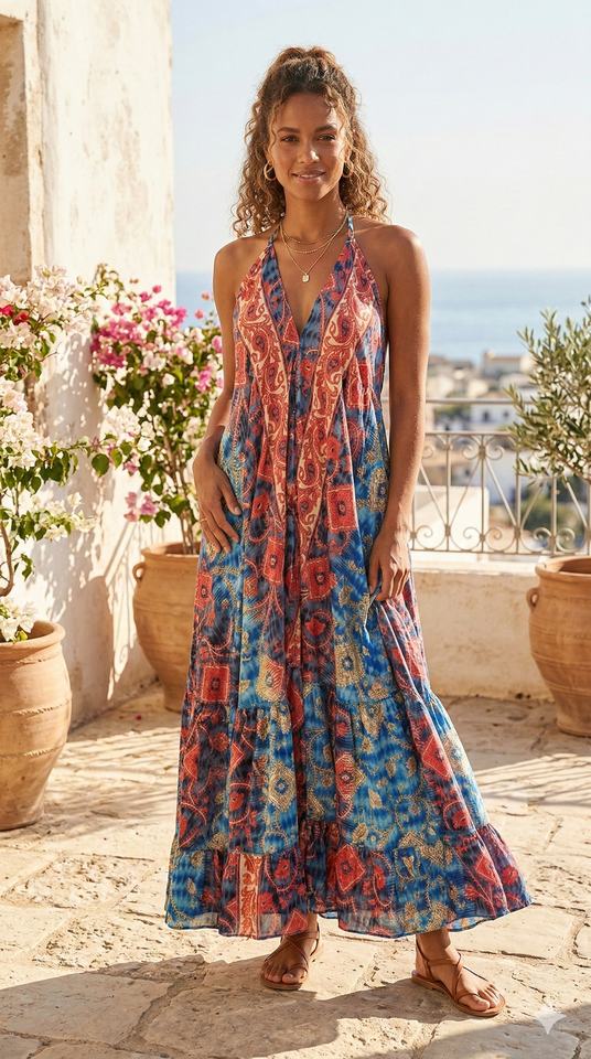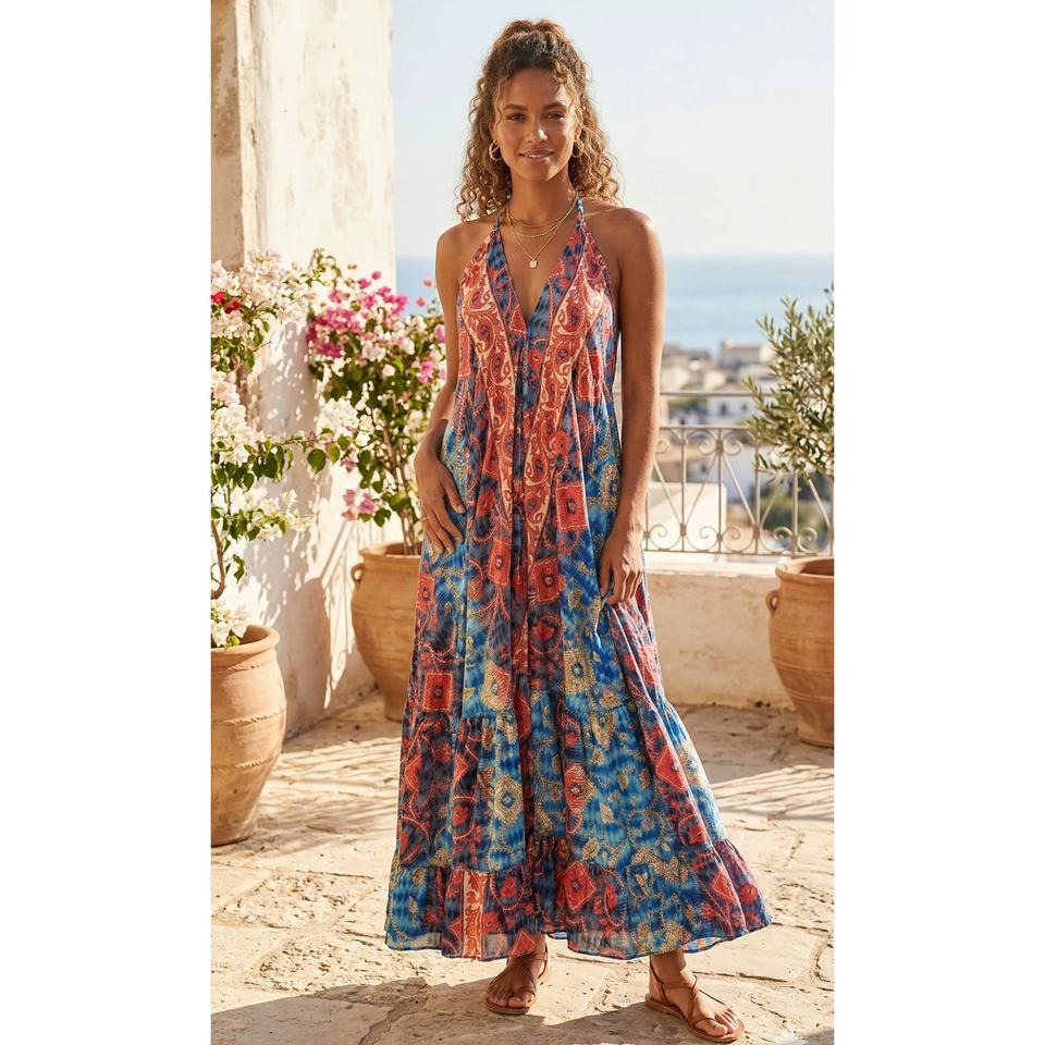 เดรสผ้าไหมพิมพ์ลายดอกไม้/ลายเรขาคณิตทรงเอไลน์ คอวี ยาวคลุมเท้า สไตล์โบโฮลำลอง สำหรับสุภาพสตรี ดีไซน์สวยงาม เหมาะสำหรับใส่ในวันสบายๆ ฤดูใบไม้ผลิ/ฤดูใบไม้ร่วง