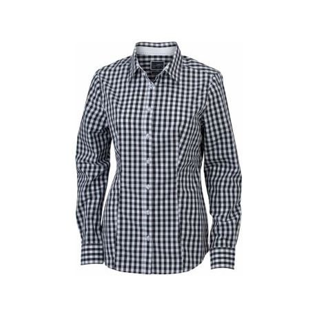 Ladies' Fashionable Satin Blouse Women's Tops in XL Size with Embroidered Logo Checked Shirt with Solid Inserts at Collar Cuffs