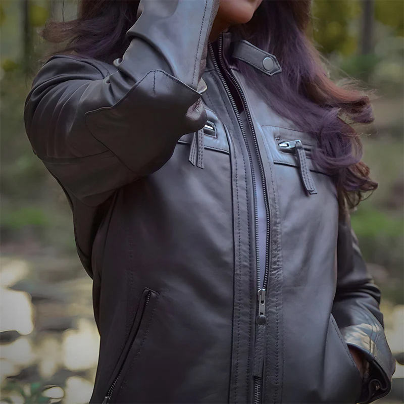 เสื้อแจ็คเก็ตหนังแกะแท้สำหรับผู้หญิง สีดำ ทรงเข้ารูป เป็นมิตรกับสิ่งแวดล้อม แบบเย็บติดกัน ระบายอากาศได้ดี สำหรับฤดูหนาว แขนยาว ย้อมสีเรียบ