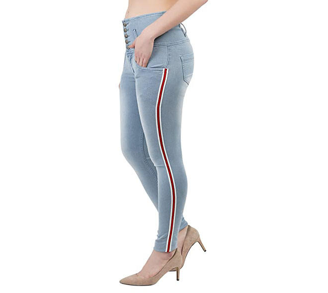 กางเกงยีนส์ขายดีสำหรับผู้หญิง กางเกงยีนส์เอวสูงทรงเข้ารูป ยืดได้ สไตล์ลำลอง พร้อมแถบสีแดงด้านข้าง