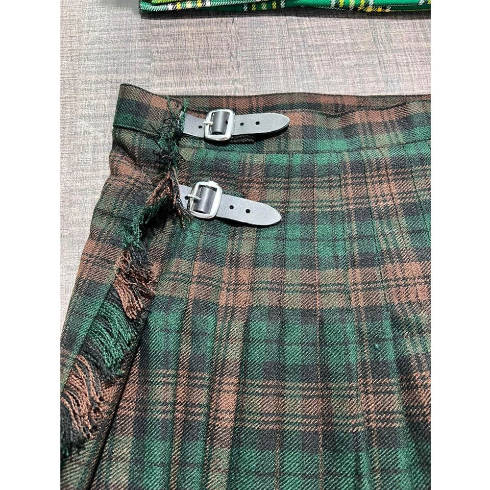 กระโปรงยาวระดับเข่าสำหรับผู้หญิง ลายสก็อตสีน้ำตาล สายหนังจีบแบบกิลท์