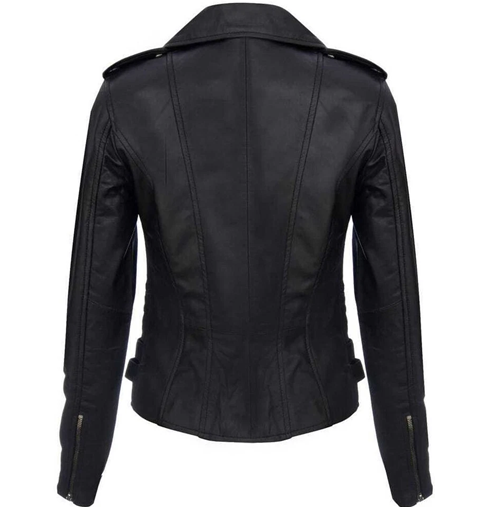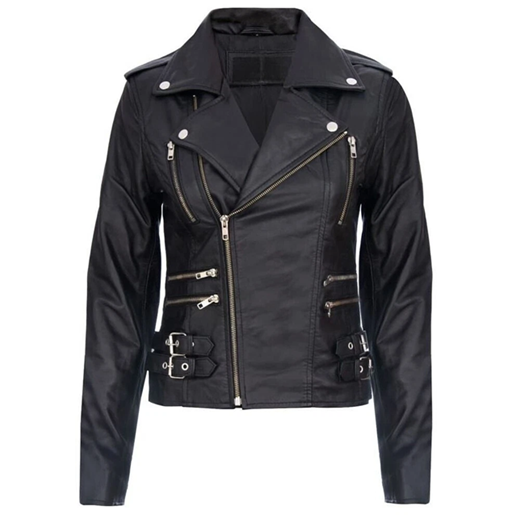 เสื้อแจ็คเก็ตหนังแท้สำหรับผู้หญิง สีดำ หนังแกะนัปป้า วินเทจ กอธิค แบบมีกระดุม