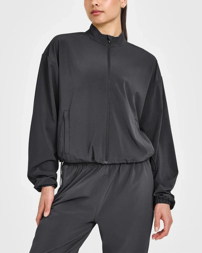 เสื้อแจ็คเก็ตกันลมสำหรับผู้หญิง น้ำหนักเบา ระบายอากาศได้ดี ทรงหลวม ซิปยาวเต็มตัว ช่องระบายอากาศด้านหลัง ปรับขนาดชายเสื้อได้ คอตั้ง เหมาะสำหรับออกกำลังกาย