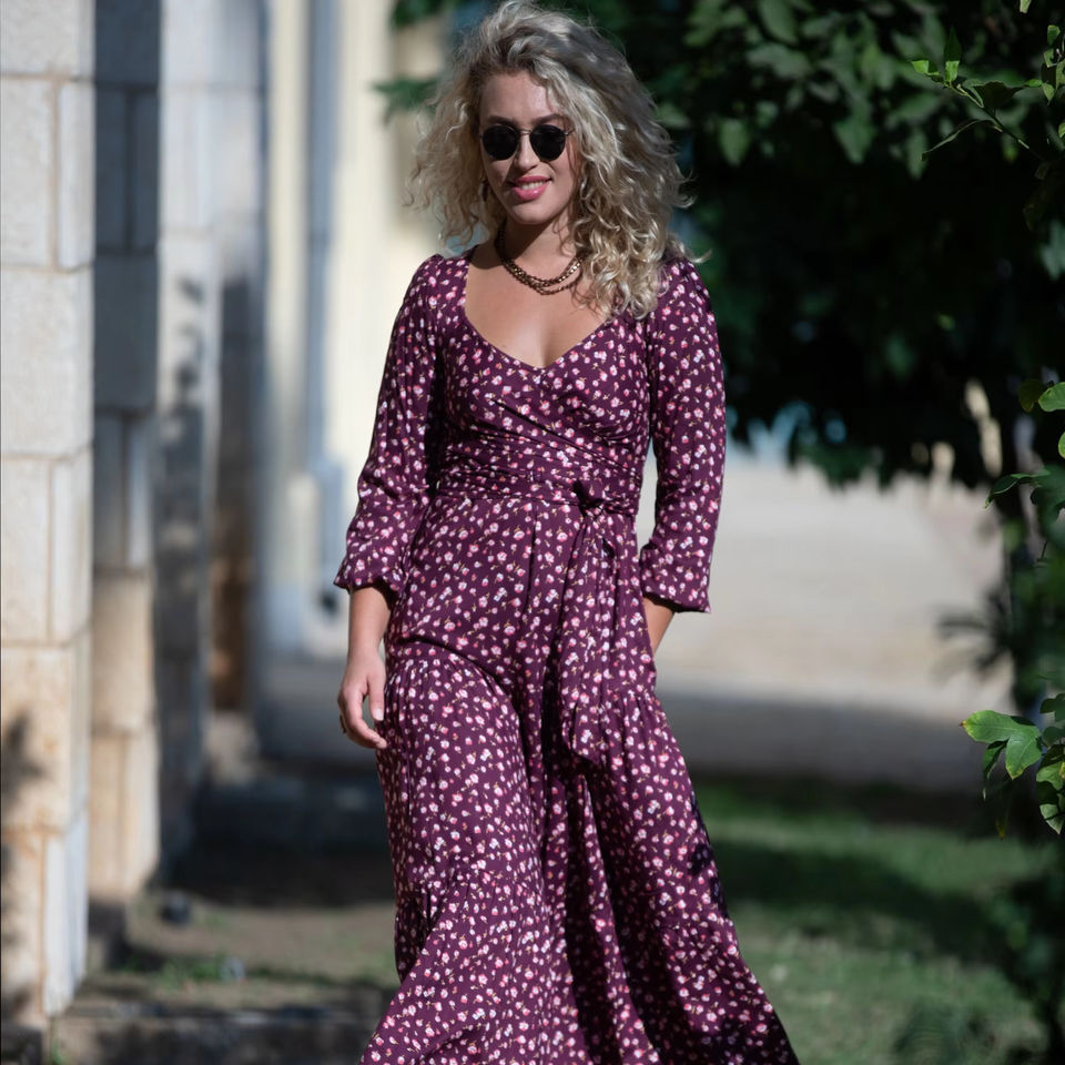 เดรสยาวคอวีลึกแขนยาวสำหรับผู้หญิงเดรสแม็กซี่พิมพ์ลายดอกไม้ผูกเอวเดรสชายหาดชุดคลุมดูไบคาฟตันโบโฮคอวี