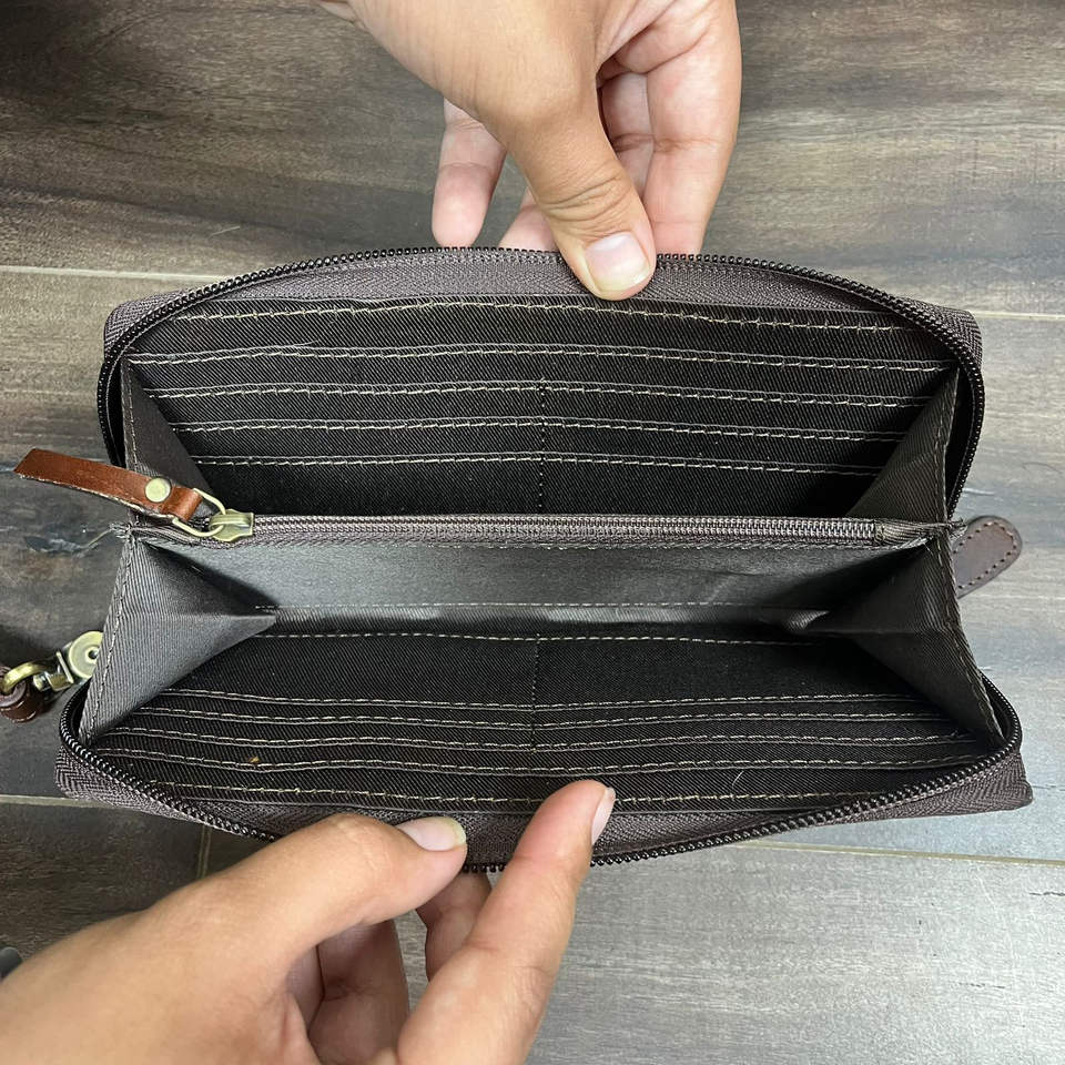 กระเป๋าคลัทช์หนังแท้ทรงยาวสำหรับสตรีหนังวัวสีทึบแนววินเทจที่ใส่บัตรหัวเข็มขัดหนังวัว2025