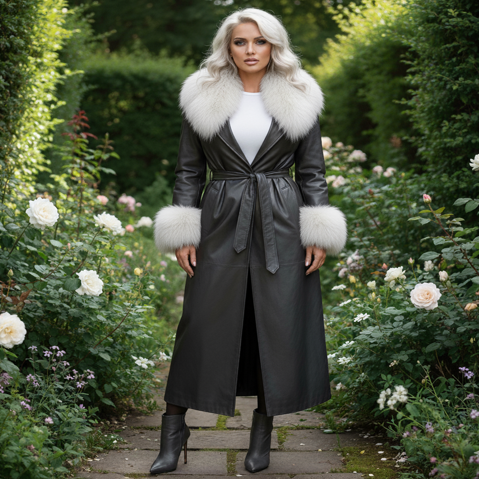 เสื้อโค้ทเทรนช์ผู้หญิงแบบยาว ดีไซน์เข็มขัดหนังปลา แต่งขนสุนัขจิ้งจอก ซับในผ้าไหม ขายส่ง รับสั่งทำ