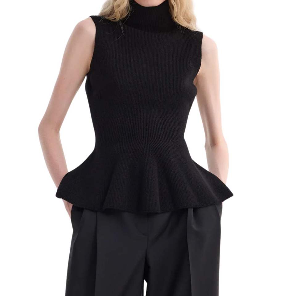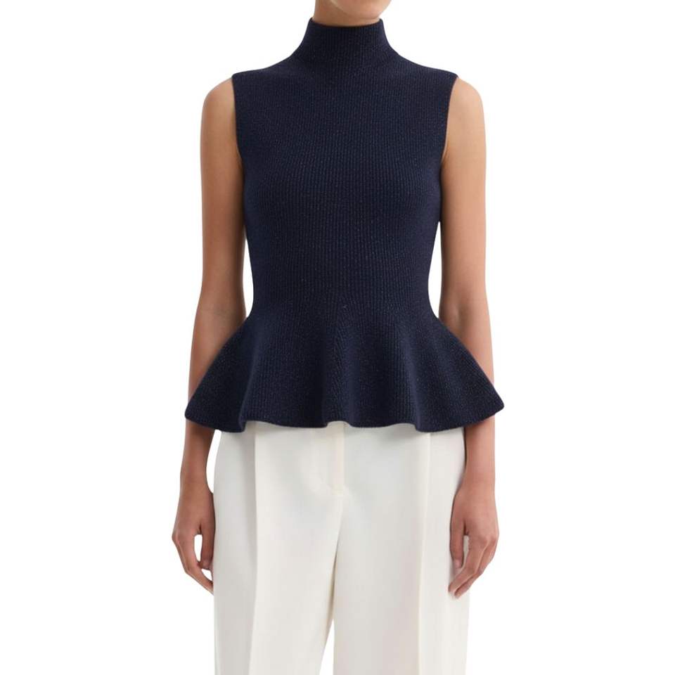 เสื้อกล้ามถักไหมพรมสีน้ำเงินกรมท่าสำหรับผู้หญิง ทรงเปปลัม คอเต่า แขนกุด ทรงเข้ารูป ผ้าริบถัก แฟชั่น