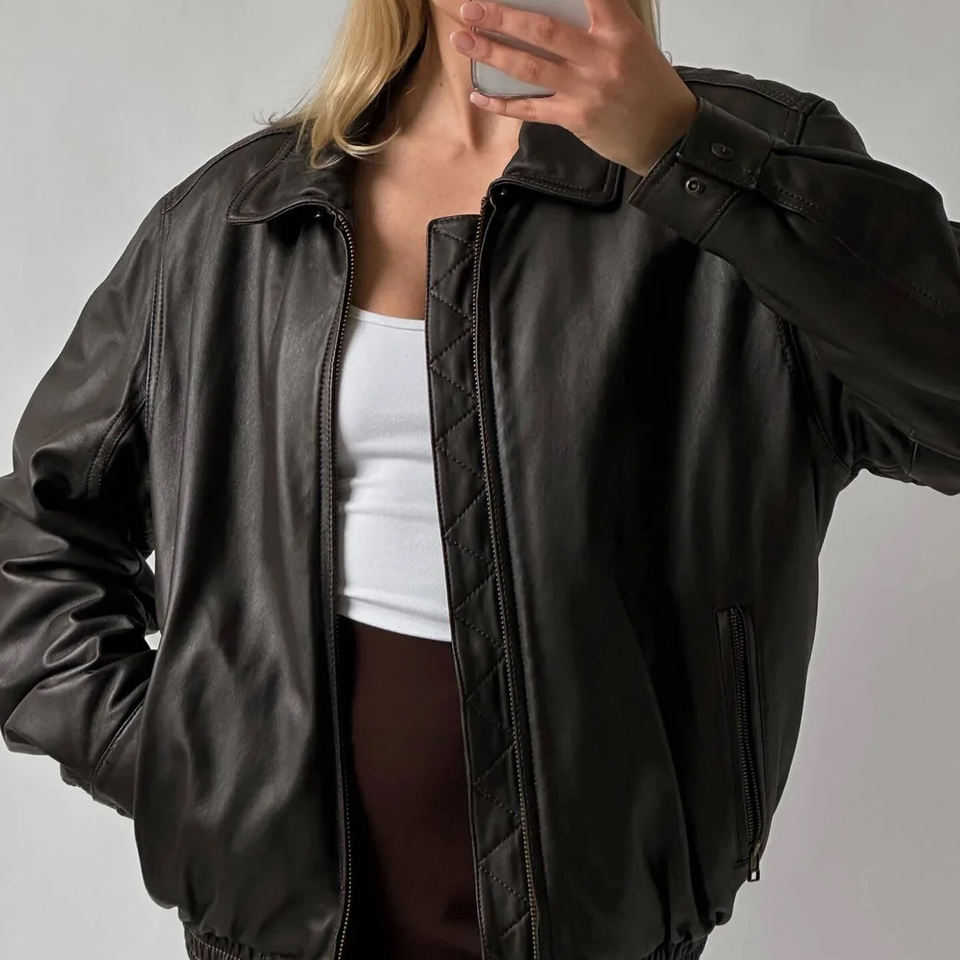 แจ็คเก็ตบอมเบอร์ไซส์ใหญ่พิเศษสำหรับผู้หญิงแจ็คเก็ตหนังแท้สีน้ำตาลเข้มลำลองสำหรับเป็นของขวัญ