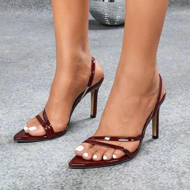 รองเท้าส้นเข็มหนังสิทธิบัตรสำหรับผู้หญิง, รองเท้าส้นเข็มสายเดี่ยวหัวแหลมมีสายรัดข้อเท้าด้านหลัง