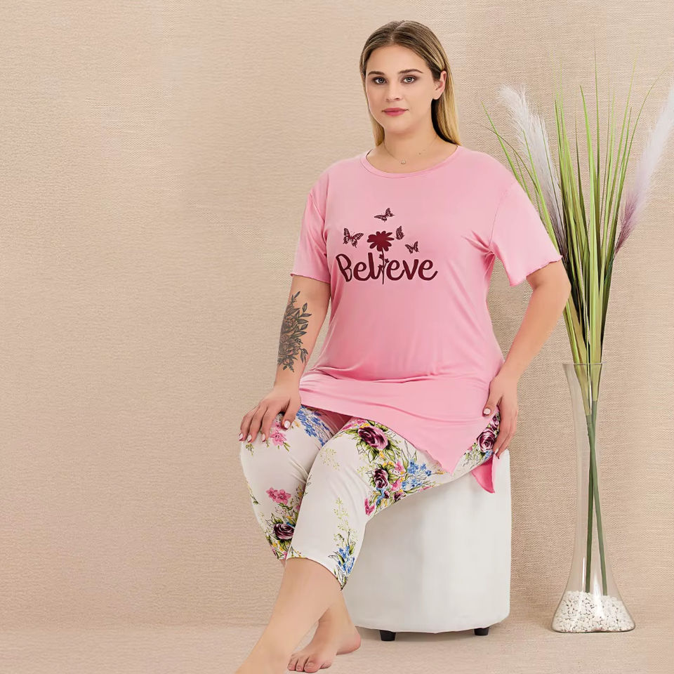 ชุดโฮมแวร์ผ้าวิสโคสถักสำหรับผู้หญิงขนาดพลัสไซส์ แขนสั้นเรียบง่าย นุ่มสบาย ใส่สบาย
