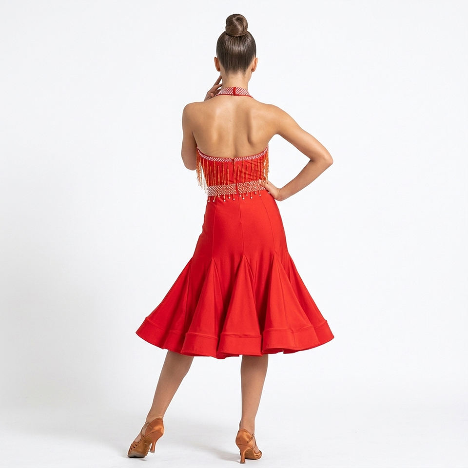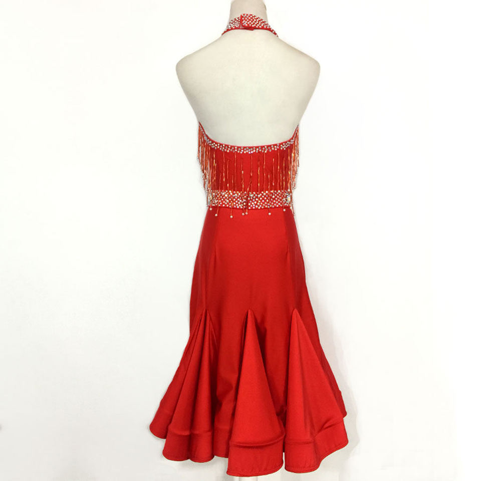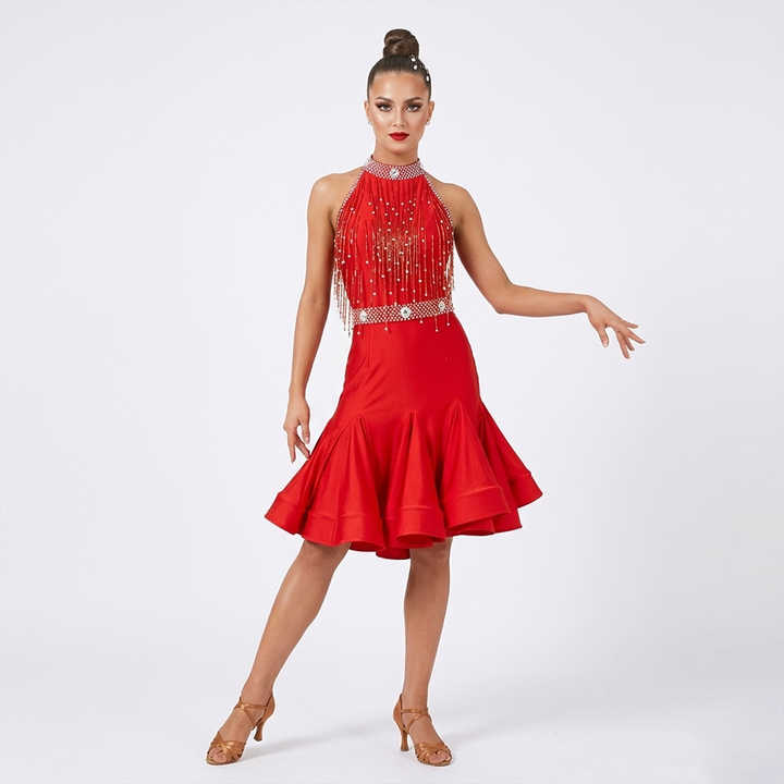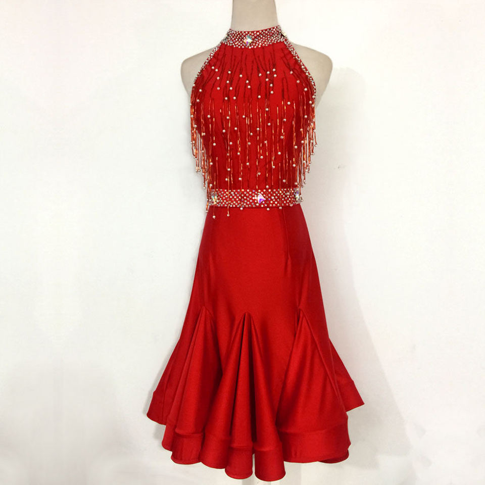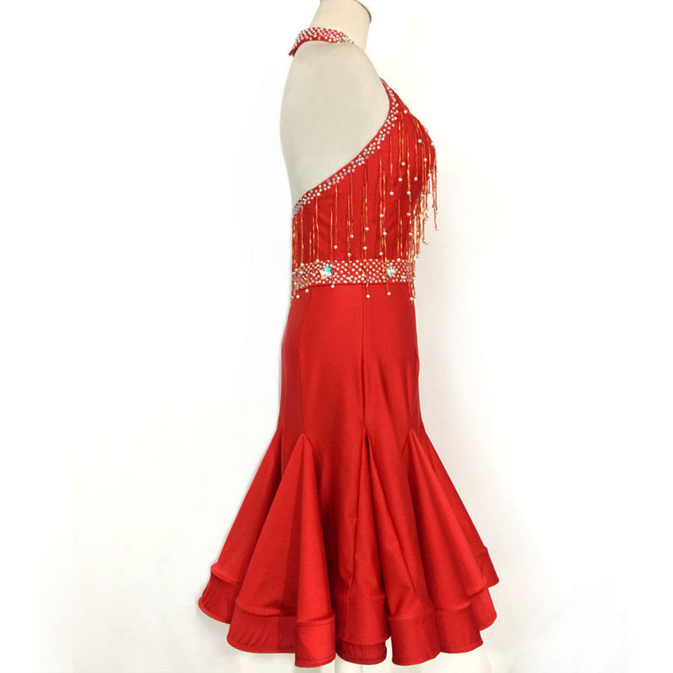 ชุดแข่งขันเต้นลาติน WDSF สำหรับผู้หญิง แบบคอ halter ประดับมุกและพู่ ทำจากโพลีเอสเตอร์/เรยอน สำหรับเต้นซัลซ่าและรัมบา