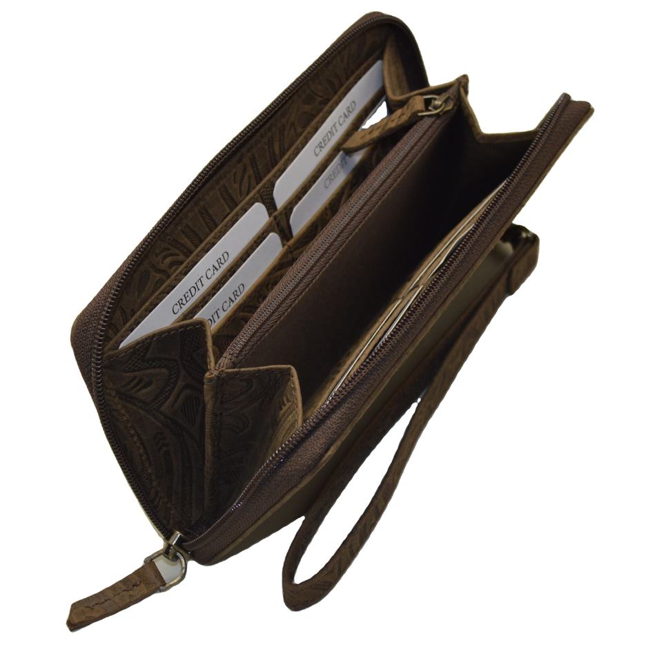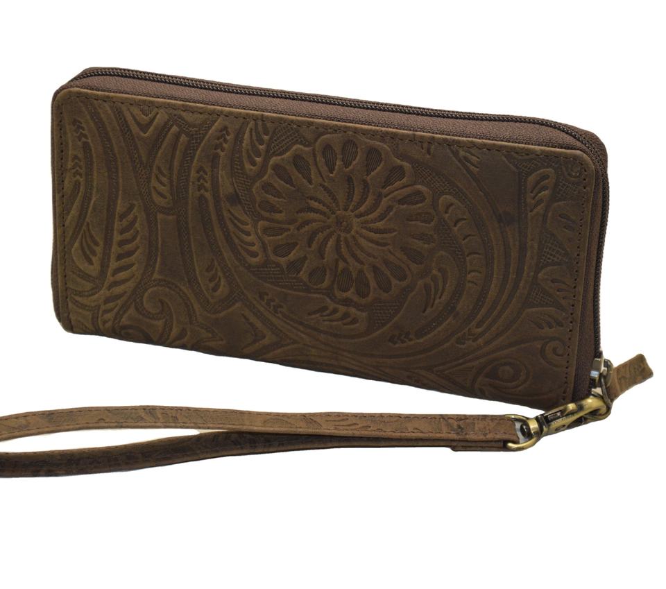 กระเป๋าสตางค์สตรีหนังแท้ย้อนยุควินเทจสำหรับผู้หญิงกระเป๋าใส่บัตร RFID ลายดอกไม้มีซิปลายนูนโพลีเอสเตอร์สำหรับเด็กผู้หญิง
